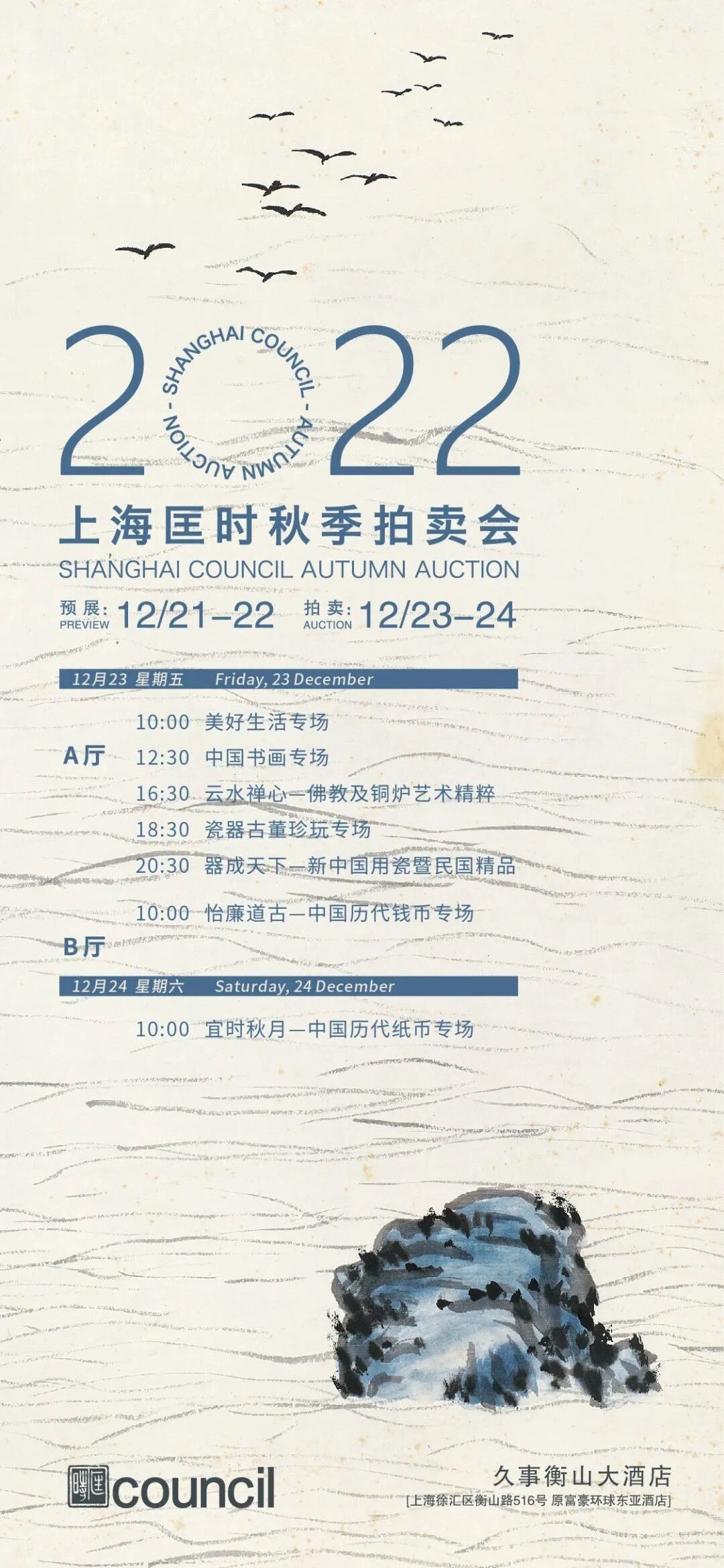 上海匡时2022秋季拍卖会于12月21日在上海久事衡山大酒店正式启幕。本次拍卖共有“中国书画专场”、“云水禅心——佛教及铜炉艺术精粹”、“瓷器古董珍玩专场”、“器成天下——新中国用瓷暨民国精品”、“美好生活专场”、“怡廉道古——中国历代钱币专场”、“宜时秋月——中国历代纸币专场” 七大专场,1700余件拍品,涵中国书画、佛像、铜炉、瓷器杂项、钱币、滋补养生、珠宝尚品、以及佳酿臻茗等诸多品类。展览现场佳作荟萃,精彩纷呈,上海匡时2022秋拍,邀您共赏,恭候莅临。