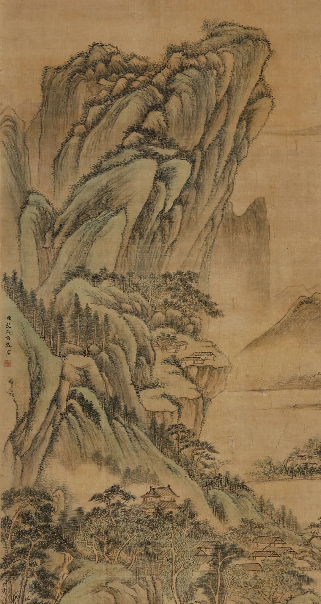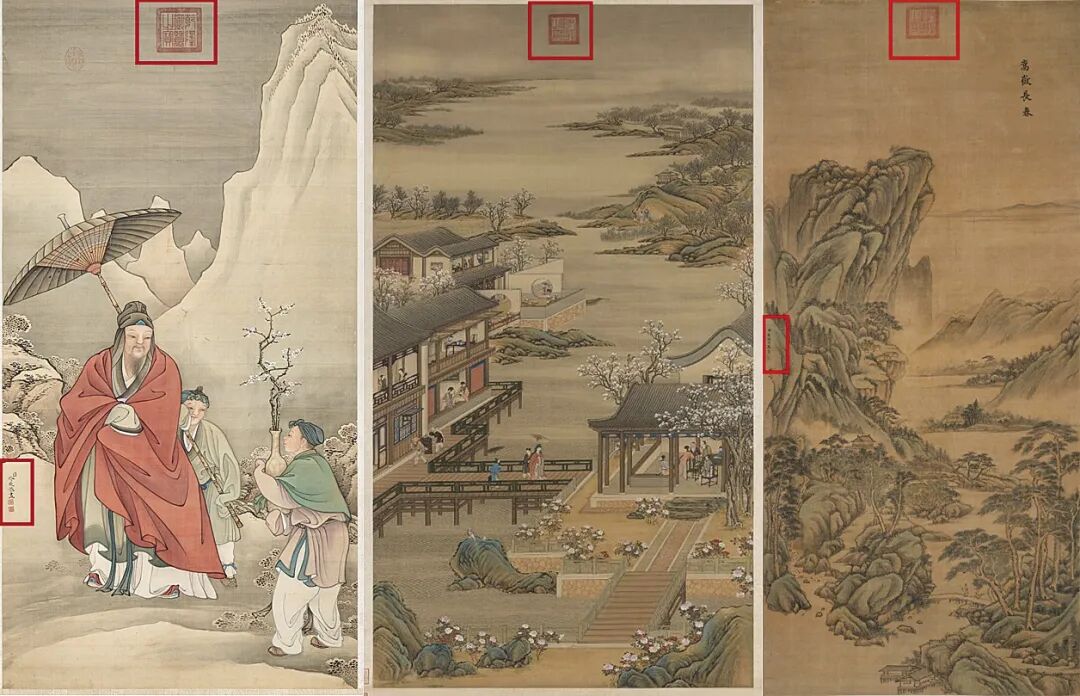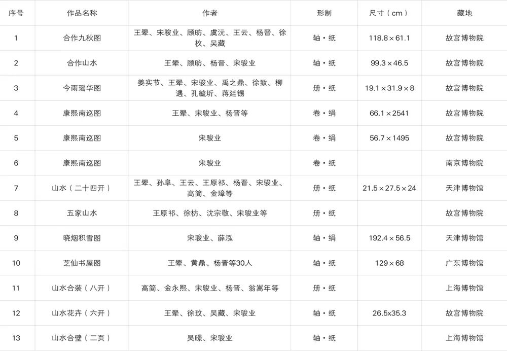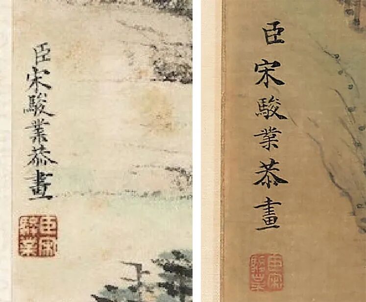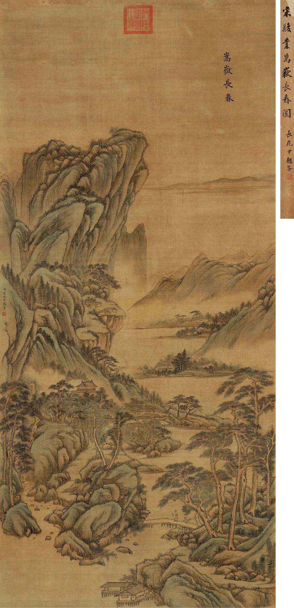 《嵩岳长春》画幅上部钤“乾隆御览之宝”朱文方印一枚,右下有楷书“嵩岳长春”字样,画幅居中左侧款署:“臣宋骏业恭画”。并钤朱文印“臣宋骏业”一方。此图以宋元笔墨兼取王石谷笔法融汇而成,描绘嵩岳之春色。构图取深远之法,众山环抱呈高山仰止之势,峰峦间的层层林木,把画面向纵深推进,层次分明,脉络清楚。以细腻沉稳的用笔描绘峰峦,设色苍润洗练,尽得山峦浑厚秀逸之态,从树法的勾勒与湖石的细皴墨染中可见黄子久与王叔明、吴仲圭的用笔特色,尤其是画中松树的绘制上更有王蒙遗风。干笔短线皴擦之后,以焦墨侧锋加墨点,苍绿之色晕染润泽,又有远处一望无际连绵起伏的山峰作为背景,对主体山峰的处理过程中,以自汲取来自王石谷的“北宗”技法用笔,硬朗皴染兼备的艺术风格表现出崇山峻岭的北方山川景色,使层叠之山峦显得更为厚重。用来点景的人物、村舍、流水等,画得十分精细,全图春意盎然,升平祥和之气,焕然笔底。宋骏业传世画作稀少,《古代书画图目》存世作品统计现藏国内各馆藏的仅有13件(见下表),且多是与其他宫廷画家合绘完成,尤其是王翚、杨晋合作的作品居多,如著名的《康熙南巡图》,表现康熙皇帝1689年第二次南巡盛况的历史图卷,共十二卷,总长213米。1690年,王翚应宋骏业之邀北上京师,率领弟子历时6年绘成这一鸿篇巨制,名动京师。能清晰找到图片资料作为参见的是现藏于台北故宫博物院的宋骏业《林亭烟岫轴》,这是一件由他独自完成的作品,一河两岸,疏林亭子,构图用笔皆出自元四家倪瓒,此图款识:“臣宋骏业恭画”,其下钤:“臣宋骏业”朱文印一枚,并有嘉庆与宣统宝玺数枚。这件作品与《嵩岳长春》一样,「款题格式均位于画幅居中偏左,画上部置顶居中处钤有帝王宝玺」,这是清早期宫廷画家款题的固有格式。例如:台北故宫博物院藏冷枚《人物图》、陈枚《十二月月令图四月》均是如此,乾隆以后宫廷画家落款主要集中于画幅的下部压脚位上。由左起依次为:冷枚《人物图》; 陈枚《十二月月令图四月》; 本幅《嵩岳长春》两画所书均为楷书“臣”字款,题写签名用笔一致,其下所钤私印也为同一印所盖。观其所绘,虽《林亭烟岫轴》多仿倪瓒用笔,以折带皴绘山石,仍可以小见大,其用笔特征变化不大,细比之下两者山石的点苔,树法尤以松树,远景的房屋,石桥的勾勒,刻绘手法均属一致。所题“嵩岳长春”,由此关联的是康熙六旬(1713年)正诞,宋骏业所绘《万寿盛典图》,后历时2年,王原祁等纂《万寿盛典初集》一百二十卷成书,在第一百八卷有记《万寿诗》有:“天禄万年八表祝乾坤并茂,圣德广被九州喜嵩岳长春,寿考作人玉宇焕文章之盛”,“嵩岳长春”是写康熙帝祝寿所用。自古有图必有史,二者相为表里。又见有北京故宫博物院藏王翚绘《仿董巨嵩岳图》轴,此图是王翚在京主持绘制《康熙南巡图》期间,为祝贺王时敏之子王掞五十寿辰而作。宋骏业师承王翚亦参与《康熙南巡图》的绘制,或受其题材影响,《嵩岳长春》以前景七棵松树最为突出,有其祝寿寓意所在,又为臣子进献帝王之作,特材特殊,意义深远。暂不深究含义,但从《嵩岳长春》在宋骏业存世作品中,仅以上述《古代书画图目》统计作品而观,实乃为宋骏业山水大成之作,原因有三:一为画法满幅幽深细密而不失于明朗,布局兼“三远法”且物象丰富。二为题材特殊,进御之作,技法出入于石谷,萃宋元诸家于笔下,具有独特的清早期宫廷绘画特色。三为乾隆宝玺,内府之珍,存世稀少,又长尾甲题签,澄怀堂著录,为清宫散轶之宝,更添弥足珍贵处。