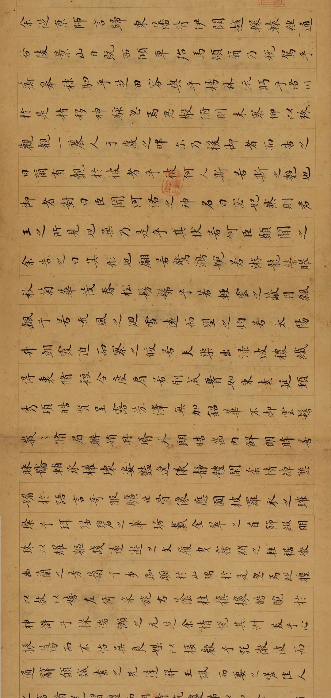 成亲王为孙尔凖所书小楷书《洛神赋》卷,以名贵的“金粟山藏经纸”写就,字小而气象不拘,笔笔刚劲有力,用笔提按自如,节奏明快,兼取欧阳询、赵孟頫法,清雅俊秀,笔画精良,于性情见法度,规矩中杂婀娜。成亲王行、楷书常见,小楷书不可多得,除公藏数件以外,散见于书画、碑帖之题跋。据林则徐后跋所称:“孙文靖公官翰林时,成邸屡以文字相属,此卷所以报也”。孙文靖公(孙尔凖)于嘉庆十年(1805)中举,“官翰林”在本年之后,时成亲王54岁,“屡以文字相属”孙尔凖,然后“此卷所以报也”,应为后来之事。其事亦与此时成亲王揉合欧赵终于自成一格之书风相合。类似的风格可参见成亲王于1816年所书《笙赋》,其结体以欧为主,兼含赵书风韵,端庄典雅,雍容流利,体现出的谨严与高深的艺术修养。![]()