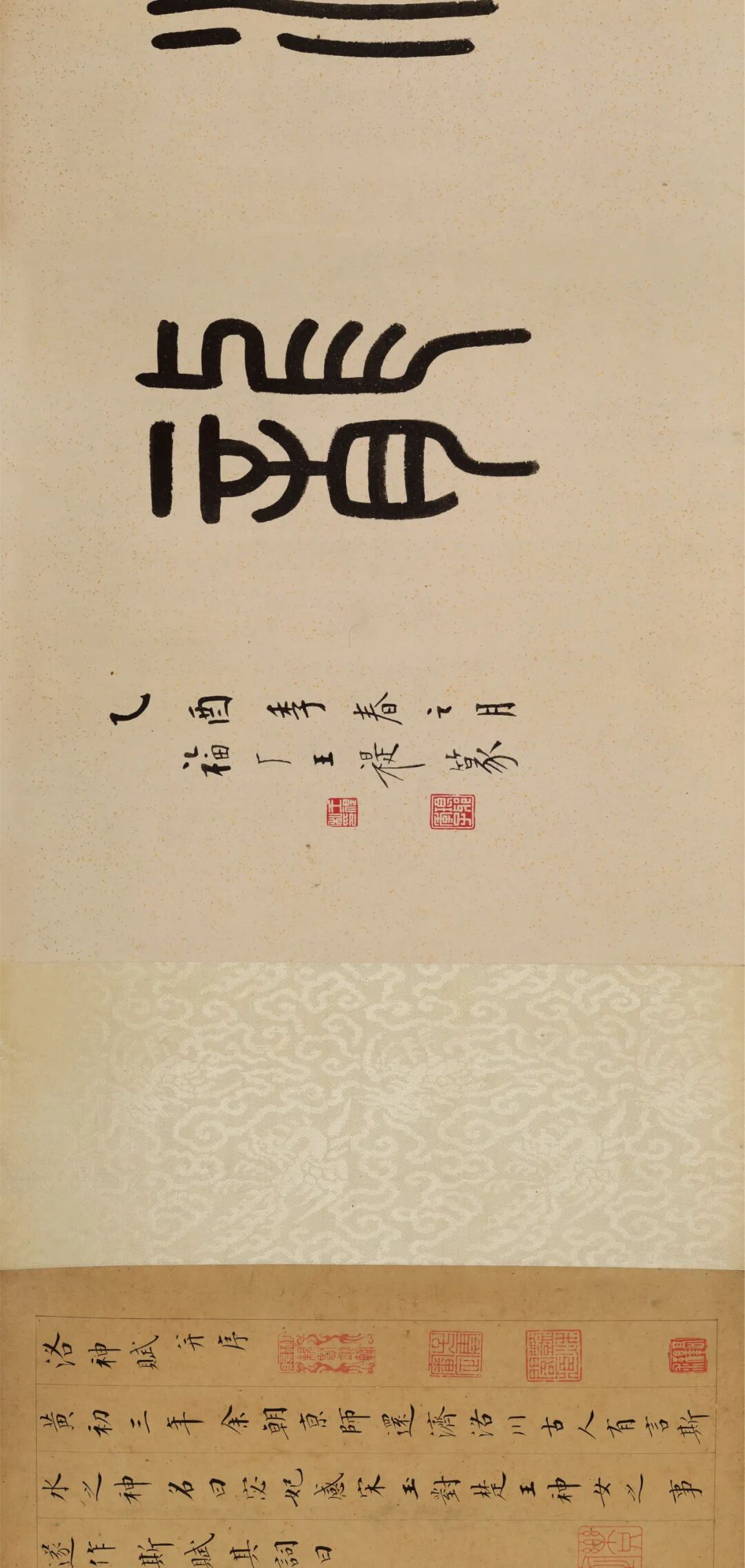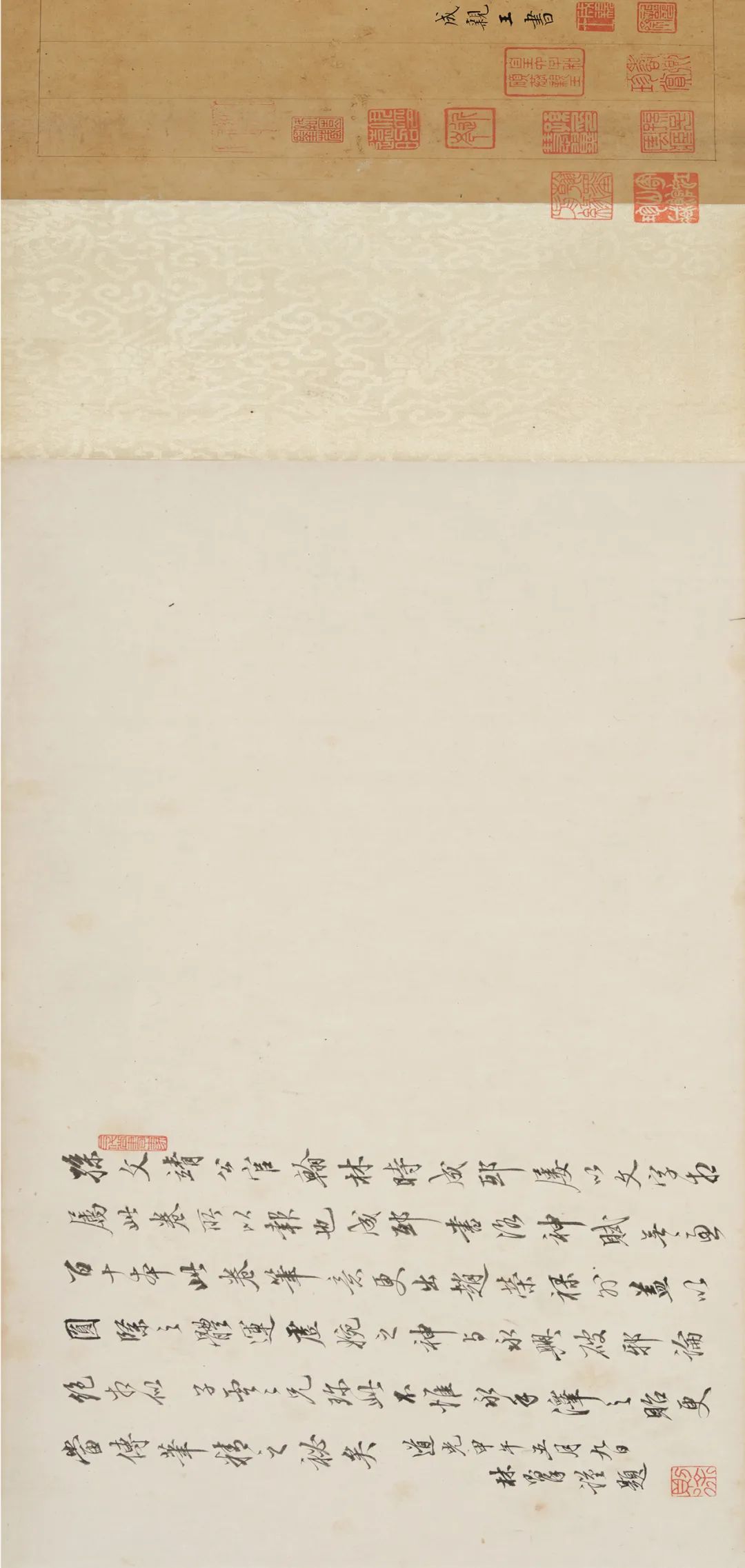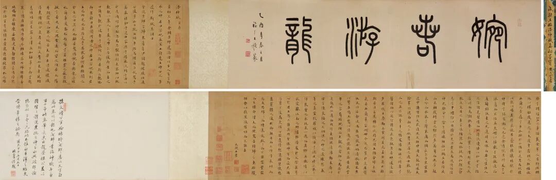 引首:27.5×95.5 cm. 书法:27.5×161 cm. 题跋:27.5×30 cm.1.孙尔凖、孙慧翼、恭亲王奕訢、陈介祺、胡燏棻、伊立勋、高络园等旧藏。2.林则徐题跋。据后跋林则徐所题“孙文靖公官翰林时,成邸屡以文字相属,此卷所以报也”可知,此卷为成亲王报答孙尔凖求教之礼。孙尔凖(1772-1832)字平叔,一字莱甫,号戒庵,金匮(今江苏无锡)人。嘉庆十年(1805)进士,官至浙闽总督,曾解决彰化械斗事件,安定台湾民心。为官政从宽大,努力修举水利。谥文靖。学问淹贯,善诗词,兼工书法,笔意似赵孟頫。著有《泰云堂集》。3. “寿卿珍赏”为陈介祺藏印。原印为故宫博物院藏陈介祺自用印之一枚。陈介祺(1813-1884),字寿卿、受卿,号簠斋、海滨病史,山东潍县(今山东潍坊)人。陈官俊子。道光二十五年进士,授编修,官至侍读学士。精鉴赏、富收藏。著有《簠斋金石文字考释·印集》《十钟山房印举》等。4.孙慧翼,字子云,行二,江苏金匮人,闽浙总督孙尔准之子,曾任兵部郎中,后为候选道。辑《艳秋阁印存》二册。5.奕訢(1833-1898),号乐道堂主人,道光帝第六子,咸丰帝同父异母兄弟,道光帝遗诏封“恭亲王”。奕訢收藏颇富,恭亲王府有藏书楼多处,主要有“多福轩”、“乐道堂”、“正谊书屋”、“庆宜堂”等,所藏宋元名椠近百种。书画最为精粹,唐、宋、元、明四代名人真迹书画作品有数十幅,如晋陆机《平复帖》、唐代的韩幹《马图》等极为珍贵。6.“寄虹山馆珍藏”为胡燏棻鉴藏印。胡燏棻(1840-1906),安徽泗州(今泗县)人。同治十三年(1874)进士。纳资为道员。1891年任广西按察使。1894年奉命在天津小站练兵,号定武军。次年上书主张变法自强。后督办芦津铁路,任顺天府尹。1898年奏请用新法操练陆军。后充总理各国事务大臣。1900年后任关内外铁路会办和刑部、礼部、邮传部侍郎。1906年任邮传部尚书。7.伊立勋(1856-1942),字熙绩,号峻斋、石琴,别署石琴老人、石琴馆主,生于清咸丰六年(1856年),室名石琴馆,福建宁化人,伊秉绶后人。清末民初著名书法大家,真草篆隶无所不能,功力深厚。曾任清光绪无锡知县,民国时期寓居上海以卖字为生。8.高络园(1886-1976),字绎求,又字弋虬,号络园。浙江杭州人,寓居上海。工书画,花卉人物而外,尤工画竹,画竹得清秀之致。其书画处名“络园”,因此为号。工篆刻,取径浙派,融会徽派及明代名家之法,所作工稳端庄。富收藏,精鉴别。成亲王永瑆作为清乾隆皇帝第十一皇子身份跻身清代书坛,在中国漫长的书法史中,为历代皇族书家之出类拔萃者。身为皇子的永瑆,在乾隆皇帝喜好赵孟頫的影响下,一生勤勉于帖学。英和认为:“成哲亲王为孝圣宪皇后所钟爱,升遐之际,颁遗念得陆机《平复帖》,王宝之,此诒晋斋所由名也”。可见,永瑆于乾隆四十二年受圣宪皇后赠送晋陆机《平复帖》,故而取斋名“诒晋斋”也表明了永瑆书学的取向。而后又称:“成哲亲王书,自幼习赵妙得神理。年五十一随扈滦阳,始改入率更之门。逾数年,以当日书洪范径二寸余大楷挂幅霉损十二字,令余补成,辞以不敢续貂”。所以,成亲王五十以后的书风是融合赵孟頫帖学和欧阳询之碑刻于一家之体。![]()