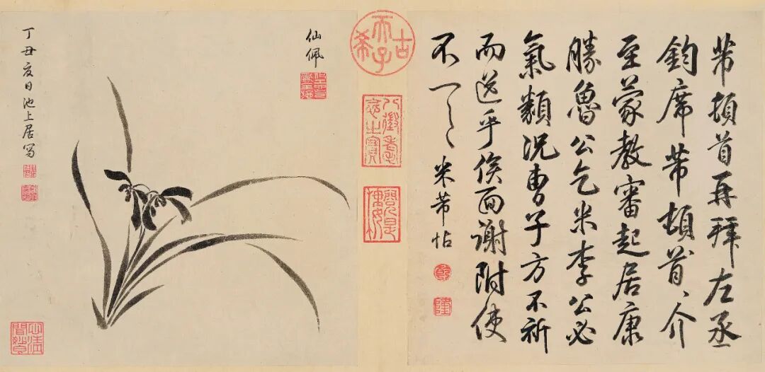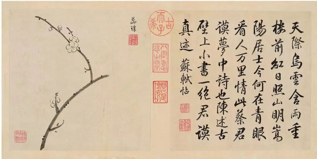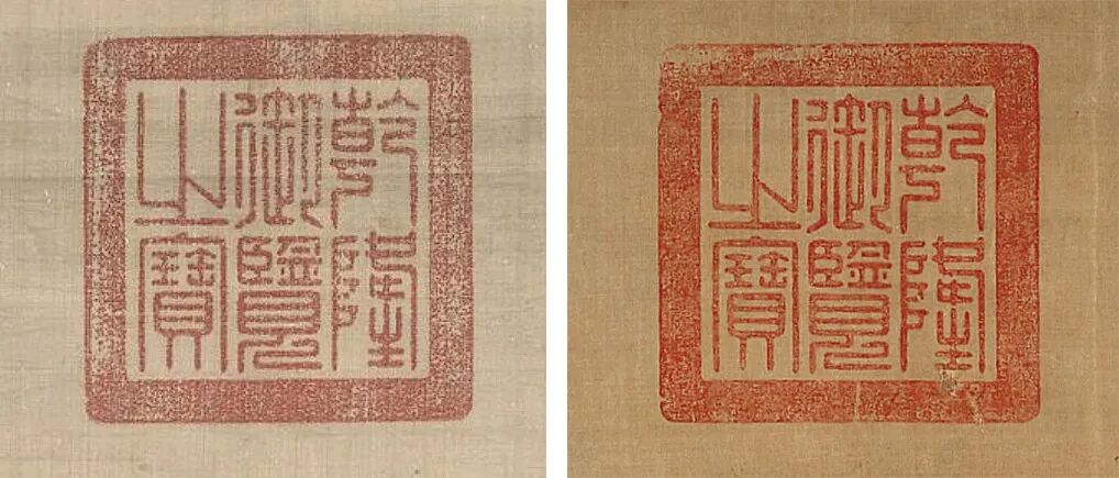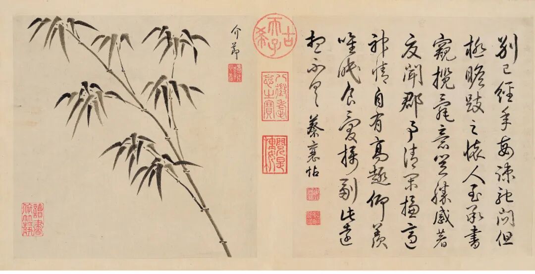 此册字画均为纸本,字和画都为纵24.5厘米、横24.7厘米。册页的骑缝处钤有乾隆的收藏印记:“古希天子”“八征耄念之宝”“阅是楼”“宝笈三编”“石渠宝笈所藏”等。