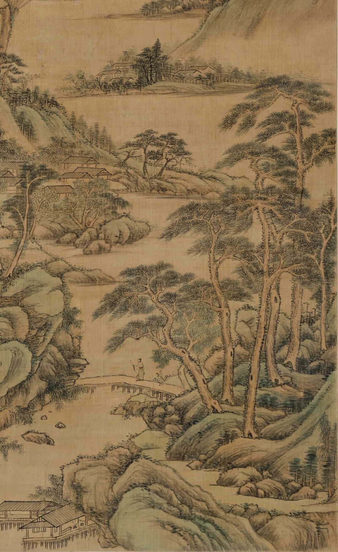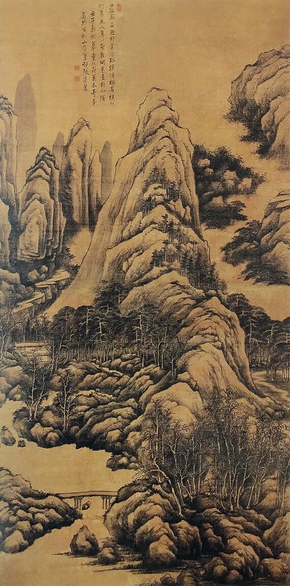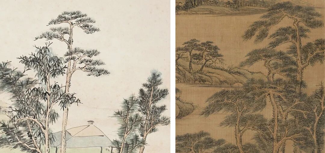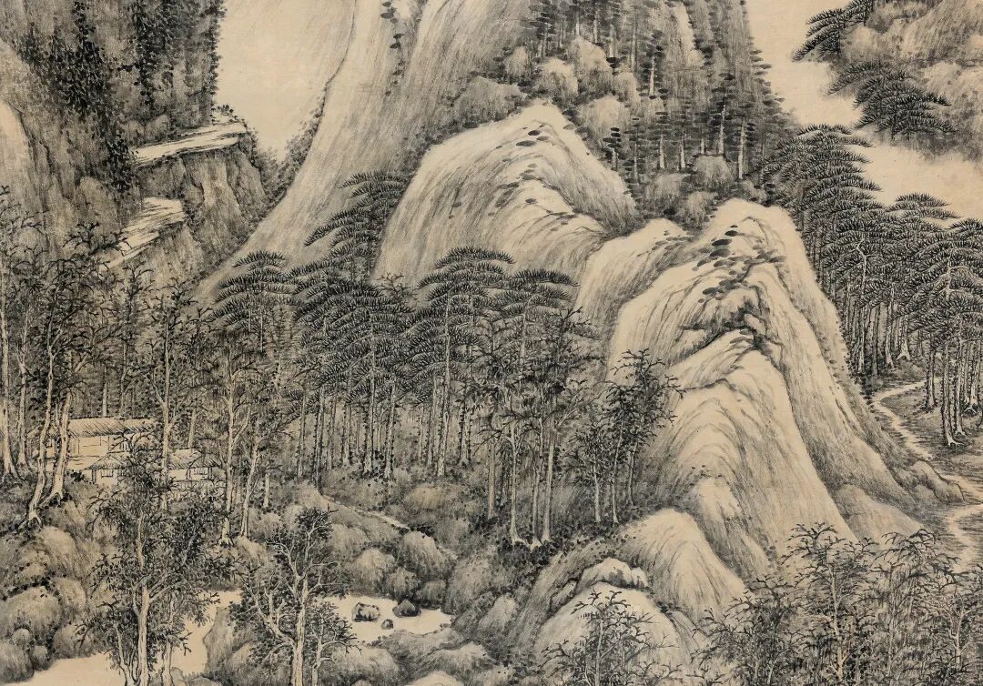 黄鼎《万木奇峰图》局部《万木奇峰图》思北苑遗法,气势雄厚,山远幽深。墨参以淡赭,使墨色柔和饱满,静秀润柔。远山又加以花青分染,清幽古雅。又间以草屋幽径打破丛林茂密之感,使整体构图更有节奏,画品超逸,可谓笔笔精妙。黄鼎早年师从丘园,后习王麓台笔,深得乾隆赏识的张宗苍亦出自黄鼎门下。朵云轩旧藏张宗苍于壬子(1732)年亦作有《万木奇峰图》,可见师法有自。![]()