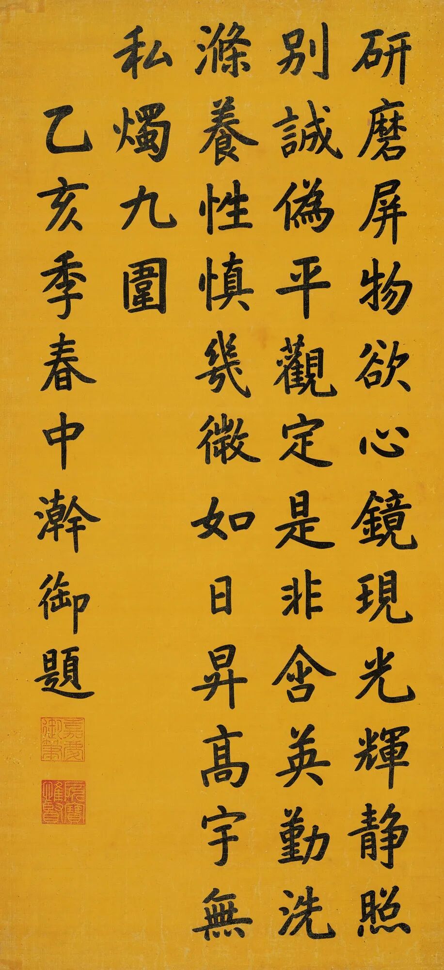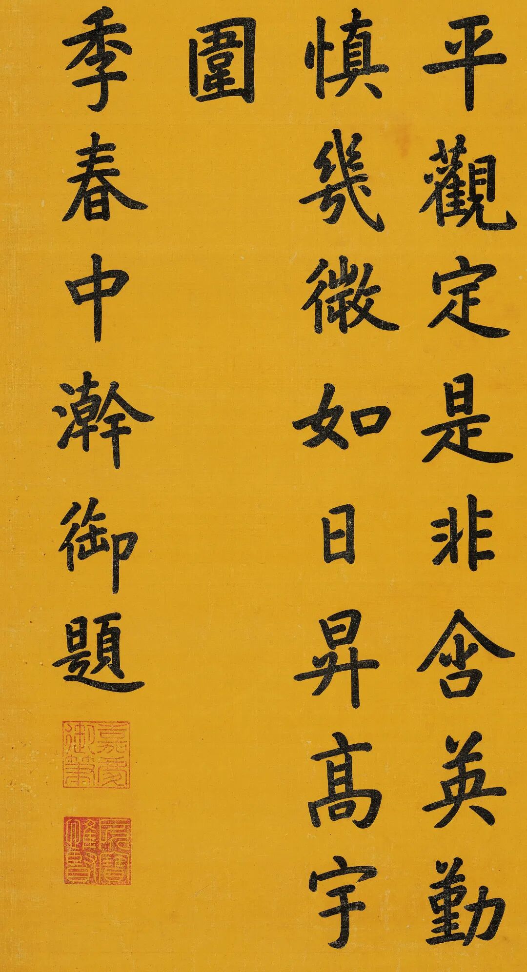 此轴为清仁宗皇帝爱新觉罗颙琰和其父乾隆皇帝《心镜斋》的一首五言律诗:“研磨屏物欲,心镜现光辉。静照别诚伪,平观定是非。含英勤洗涤,养性慎几微。如日昇高宇,无私烛九围。”全诗正楷书就,典雅平和,刚劲古拙,隐隐透露出金石味道。嘉庆时碑学已然兴起,点画也颇受时风影响,淳古厚重,间有金石千钧之力。![]()