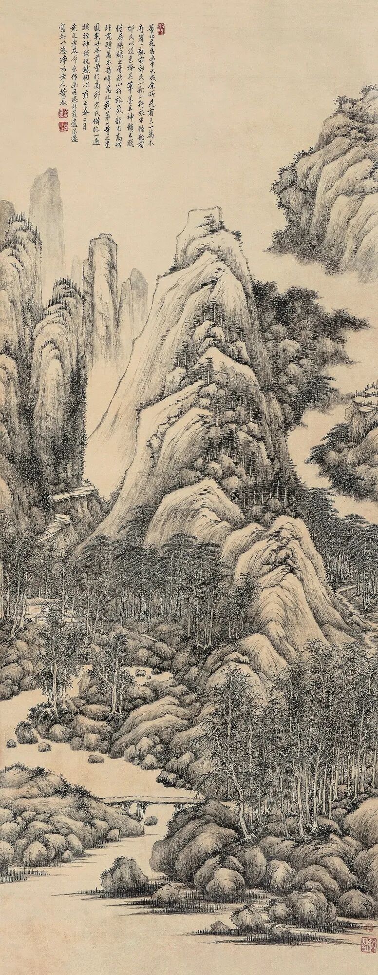本幅《万木奇峰图》中黄鼎题言:“万木奇峰为北苑第一等之星凤矣。廿年前曾於商邱宋氏借临一过,蹊径神韵恍然胸次。”黄鼎曾客居著名收藏家宋荦府邸,宋荦常与黄鼎同观历代名迹,传移摹写,少时又游历名山大川,注重写生和师法自然,把自然的真实感受融入绘画,形成自家面貌。沈德潜《归愚文钞》载曰:“王翚看尽古今名画,下笔自有成处,尊古看尽天下山水,下笔具有生气,并称大家。”![]()