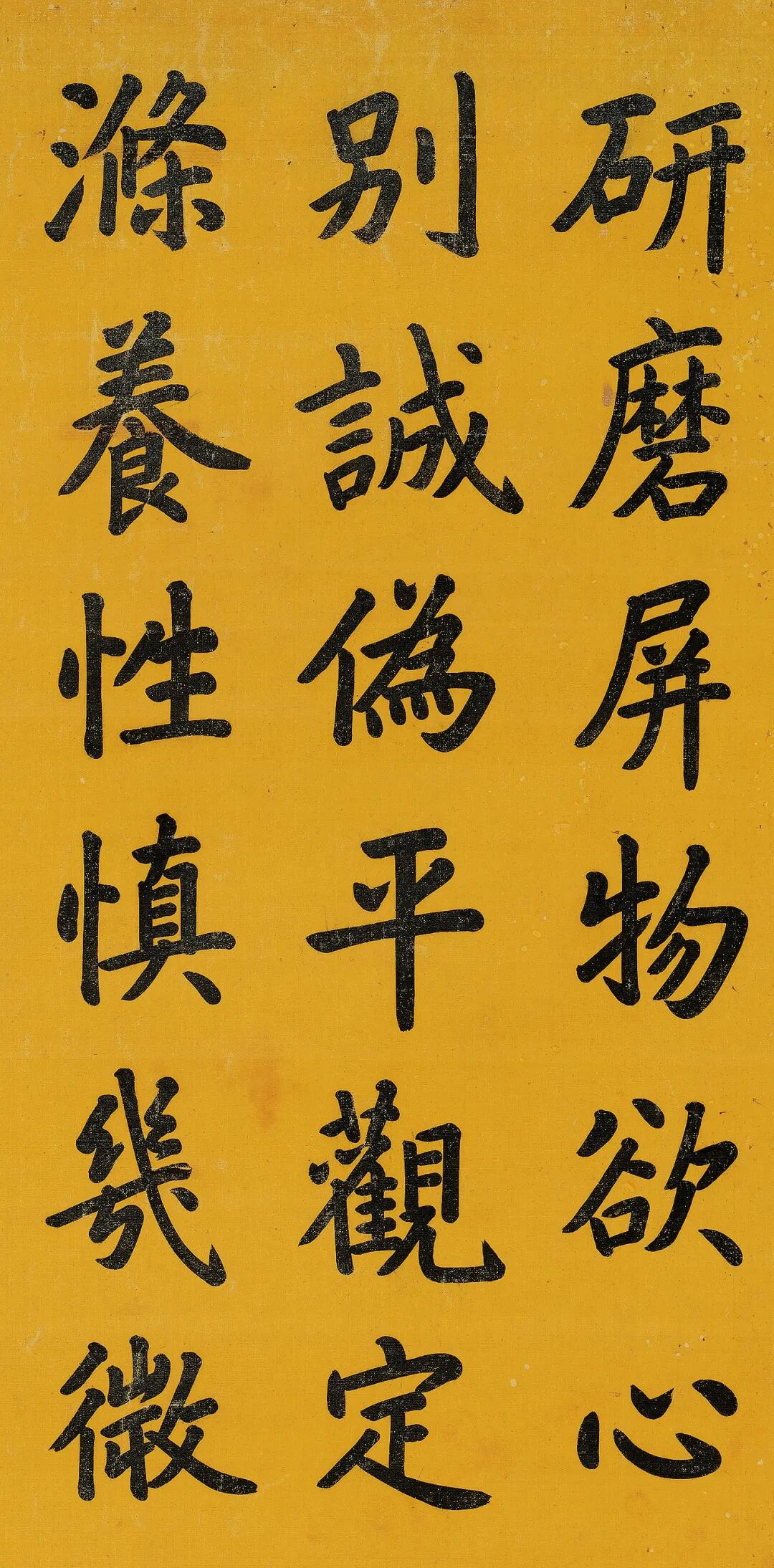 嘉庆皇帝此书正如其人,肯实坚定,不激不厉。点画用笔平实,不尚花巧,务把每笔都中锋铺写到神完气足,结字守正不欹,宽绰有余而八方安定。这种作字境界恰如诗中屏物欲、静照、平观、养性的写照。诗境仿佛将欣赏者带入一个画面,诗人从研墨开始便从容淡定,将全诗一笔一划写毕,始终平静自然,内心也得到升华。