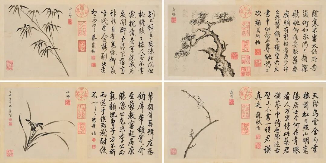 乾隆帝《书画合璧册》局部中国历代的皇帝中,还有若干人擅长绘画及书法,比如北宋的徽宗皇帝赵佶(公元1101—1125年在位),其“瘦金体”的书法,极具特色,他的绘画作品,工致华丽,他和同时的画院画家一起创造了“宣和”时代的绘画高峰。又比如明朝的几个皇帝也都能画,与当时的宫廷画家相比,画艺确实并不逊色。但是宋徽宗是个公子哥,以至最终和他的儿子一起当了金国女真人的俘虏,客死于五国城(今黑龙江依兰县);明朝的几个皇帝也是长期不理朝政,声名和政绩都很差。那么将乾隆皇帝与以上那些皇帝比一比,似乎他还有些优势。乾隆皇帝不是“亡国之君”,对待政务也算尽力,事无巨细都还想要过问。对于当时的人来讲,情愿要一位这样的皇帝,也不想要一位精通画艺,却将天下治理得一团糟、鱼肉百姓的皇帝。因此我们对于乾隆皇帝绘画作品的艺术质量,也就不要过于苛求了。此《松竹梅兰图》册就是乾隆皇帝兴之所至临写古代法书名家时配画的。四幅图页分别绘有具有象征意义的松、竹、梅、兰四种植物。第一幅为松图,画幅上画家自题“贞干”,右幅临写的是唐朝颜真卿的字;第二幅画竹图,画幅上题“介节”,右幅临写的是宋朝蔡襄的字;第三幅画梅花图,画幅上画家自题“蕊珠”,右幅临写的是宋朝苏轼的字;第四幅画兰花,画幅上画家自题“仙佩”,右幅临写的是宋朝米芾的字。![]()