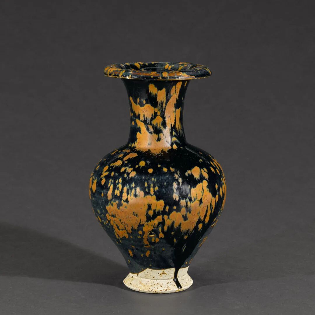 △磁州窑黑釉铁锈飞斑卷口瓶