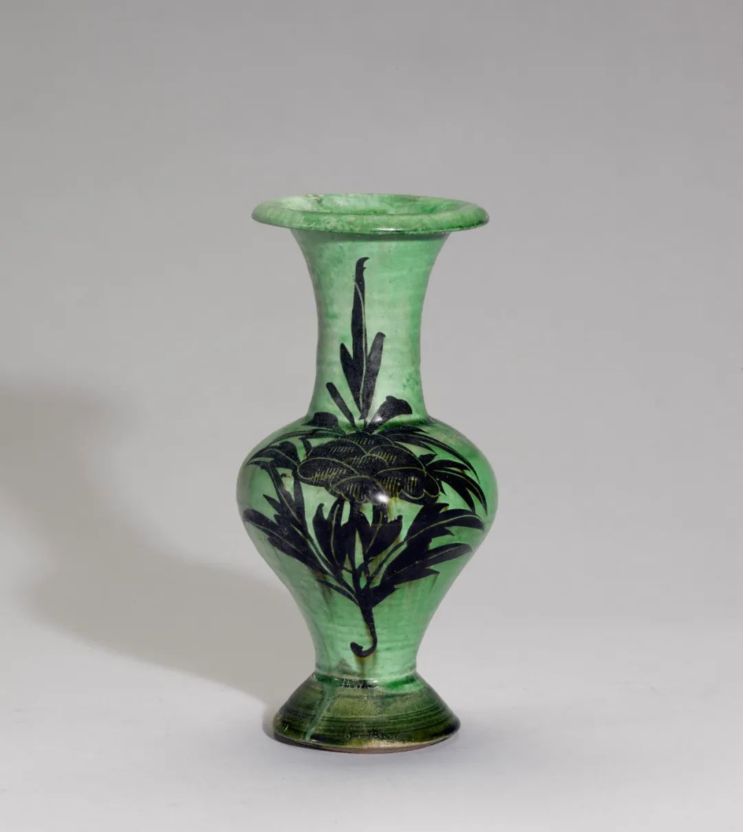 △磁州窑绿釉墨彩牡丹纹卷口瓶