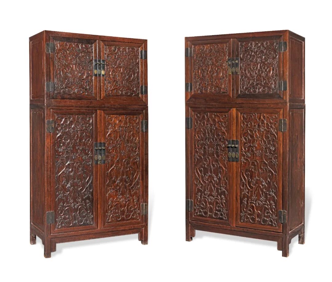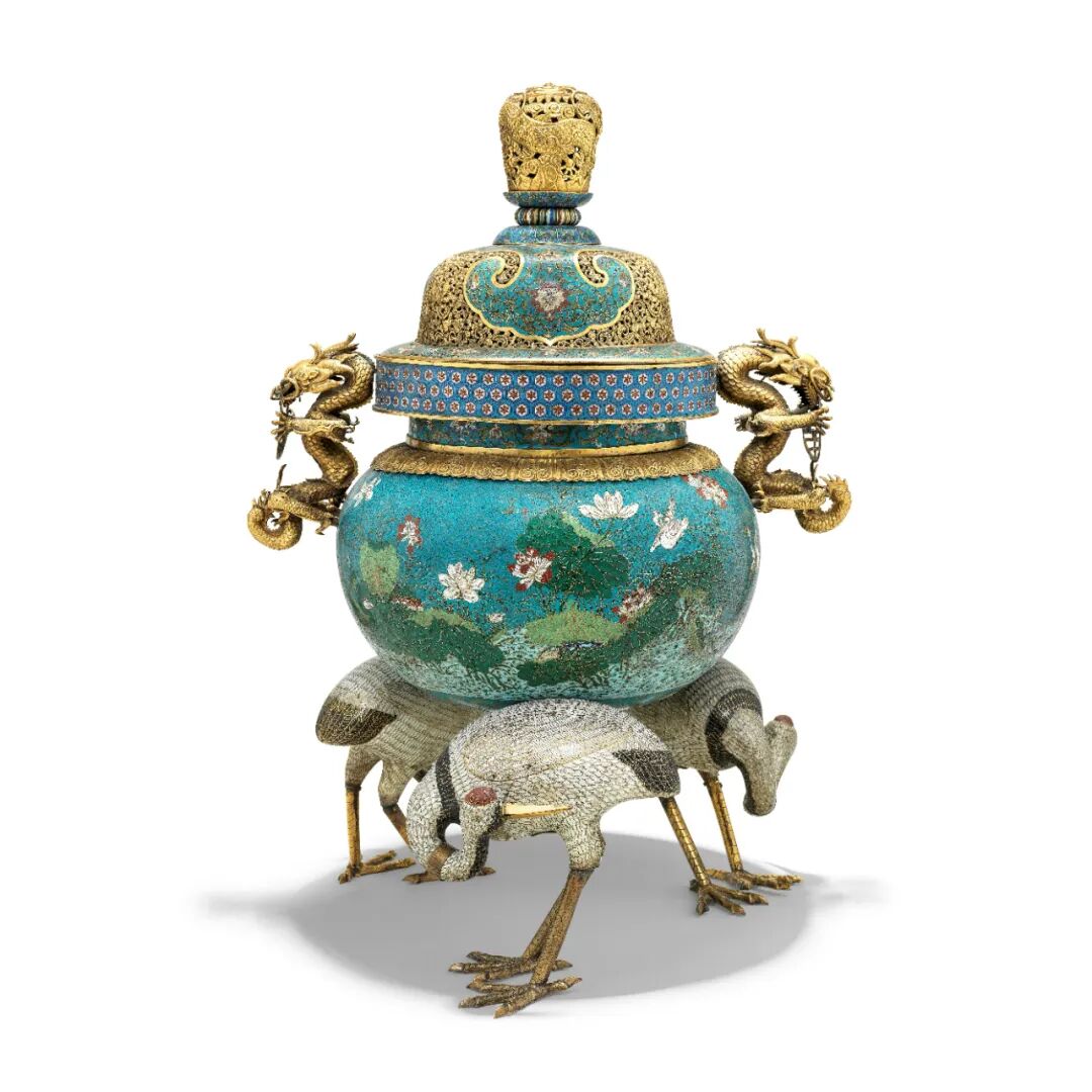 另外两件珐琅铜器均来自【中国工艺精品暨书画】专场,领衔的是一件掐丝珐琅石榴纹盖盒,来自二十世纪最为重要的中国艺术收藏家之一:英国Cunliffe勋爵,此盒以晕染技法表现瓜果,足见彼时掐丝珐琅制作技艺之高超;另一件铜胎掐丝珐琅鹭莲图鹤寿三足大熏炉,是宫廷御用掐丝珐琅精品,器型饱满大气,掐丝工艺精湛,原配熏盖,盖顶龙钮,气势非凡!