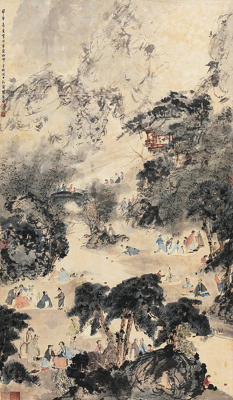 1945年夏天,傅抱石惨淡经营,将先前的横幅构图改成了竖轴构图,再次创作,全景再现“西园雅集”。