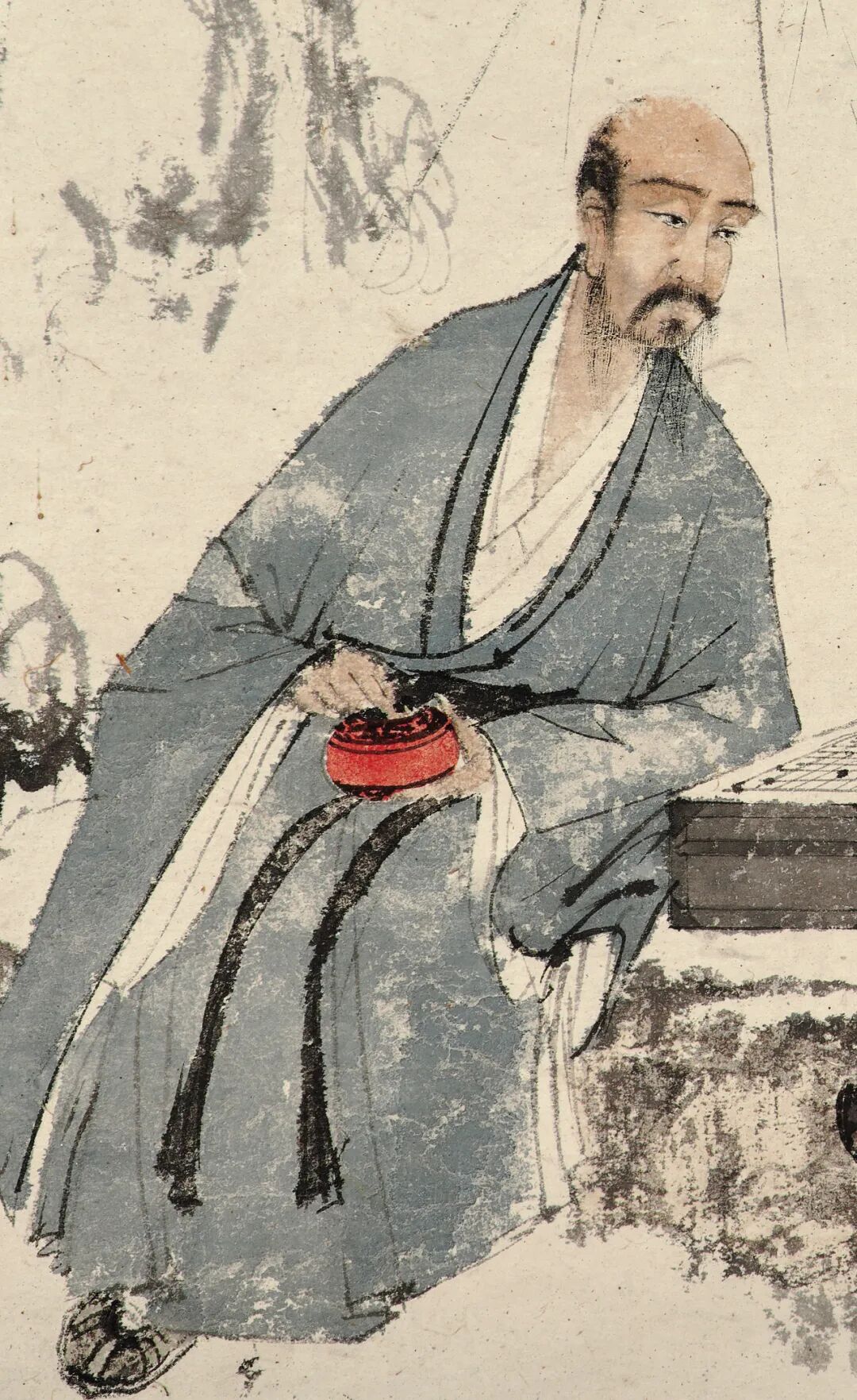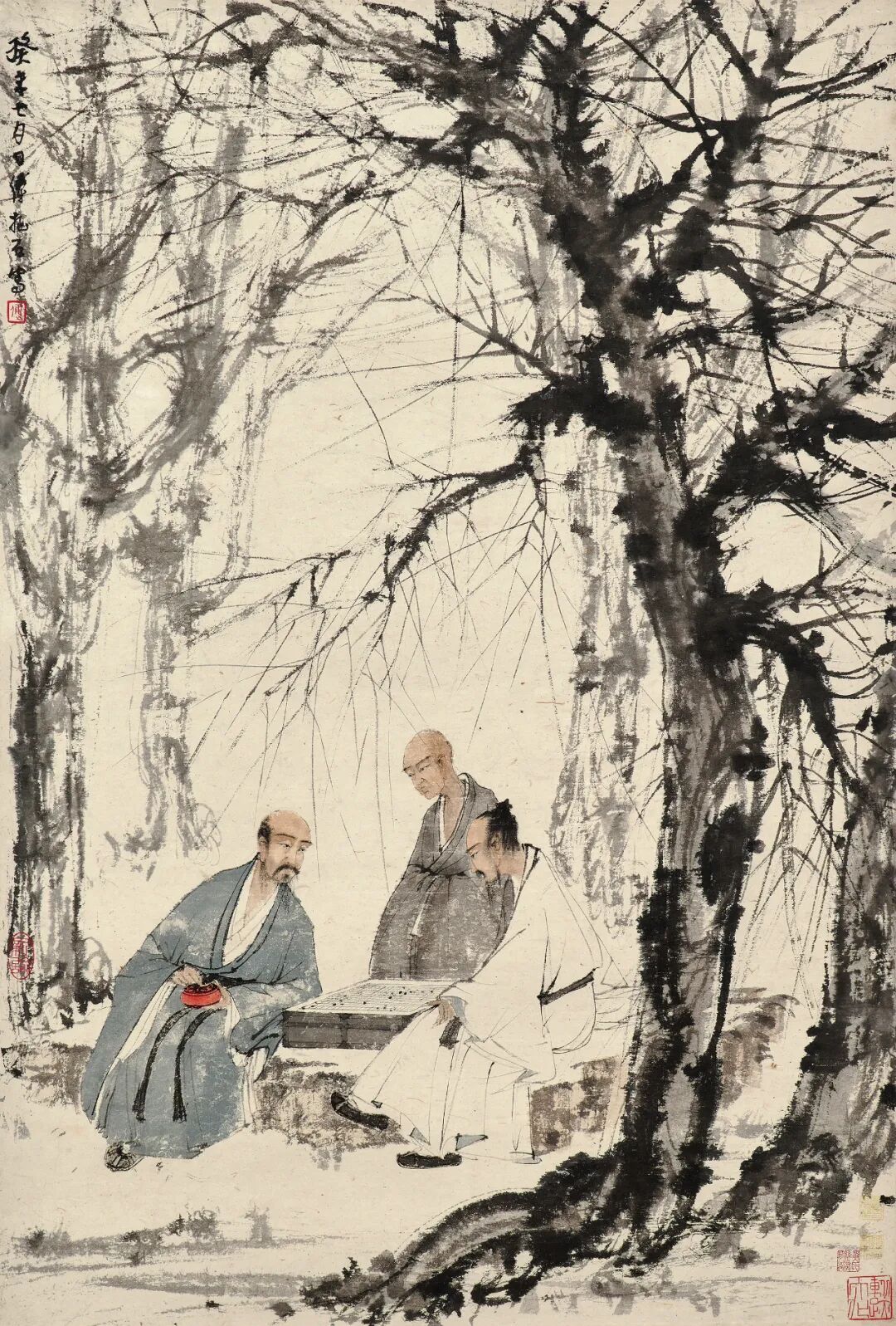 1943年8月7日,傅抱石精心经营完成《对弈图》:寒林中,三人围拢棋坪,两人捉对厮杀,青衣道人持盂拈子,身体向前微倾,全神贯注,仔细地推敲着;白衣文士则翘脚而坐,一手扶膝,略垂首,貌似神定气闲,也认真地思量瞬息变化。傍观者为高僧模样,双手合拢于宽袍阔袖内,凝息不语,静观其变,俨然一派清寂忘忧的世外桃源之境!