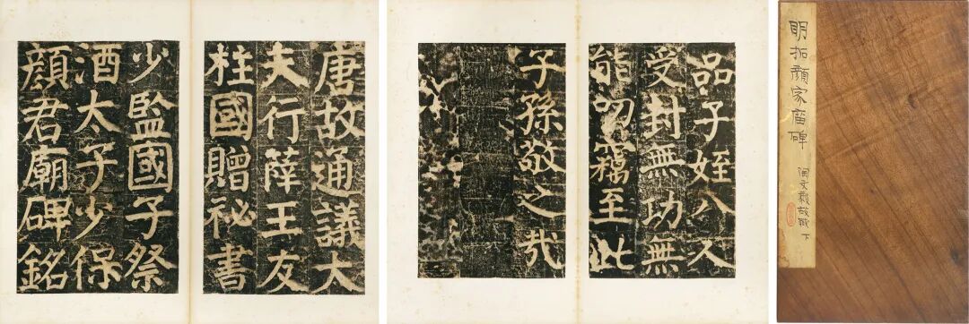 原装旧裱,大两册,品相完好,是碑全称《唐故通议大夫行薛王友柱国赠秘书少监国子祭酒太子少保颜君庙碑铭并序》,颜真卿书,唐建中元年(780)立于长安(今陕西西安)。是碑为颜真卿晚年之作,笔力雄健,结体茂密。原碑先存西安碑林。此本左侧二行「蒙教笔法」之「蒙」字未泐,阴十五行「使者」之「者」字「土」部未泐,是难得的收藏佳品。