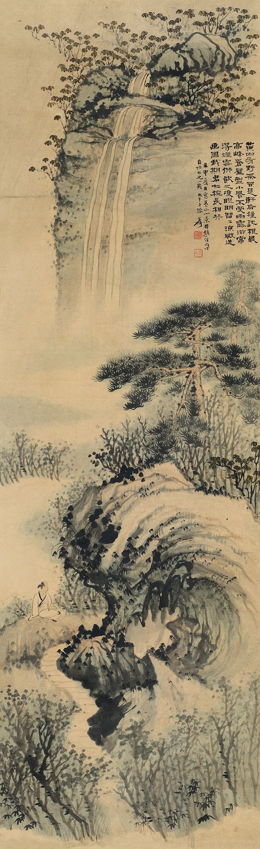 此幅《黄山小景》,创作于1932年,为张大千应王蔼云之请而作。早期的张大千曾遍临古画,对二石、八大、徐渭以至宋元诸家,皆能得其精髓。此作画风仍以宋、元、二石为指归。从绘画技法来看,此作中处处可见王蒙“牛毛”、“解索”皴法,用笔参差繁复,却又笔笔清疏劲健,用中锋勾勒出树石整体的轮廓,用率意轻松的侧锋皴擦树石内部的结构,中、侧锋用笔的连贯流畅,赋予了树石块面一种奇特的起伏的活力。而王蒙特有的“浑点”、“破竹点”、“破墨点”有大有小,有浓有淡,或疏或密分布于山石树干之间。点的十分沉着利落,呈现出一种青苔密集、岚气浑厚的景象。远处悬泉飞瀑,倾泻而下。画面结构满实繁密,而云雾环绕又显空灵,崖上高士,道骨仙风,风姿飘逸,隐喻了大千对交情深厚的好友的赞叹并发生出透出一种空灵秀逸的韵味。
