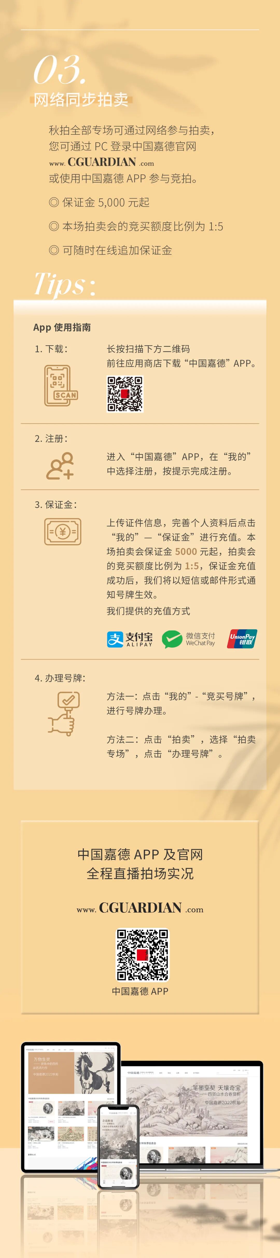 12月9日,中国嘉德2022秋季拍卖会预展拉开帷幕,一场展现艺术力量的盛宴隆重开启,希望您能在这场期盼已久的拍卖会上收获心仪的拍品,梦想成真。即使您不能亲临现场,也可下载中国嘉德官方APP,通过网络同步拍出价,或者以书面及电话委托等形式参与竞投。本季拍卖会将对拍卖现场实况进行全程直播,您可通过中国嘉德APP,身临其境观看现场盛况,感受拍卖氛围。