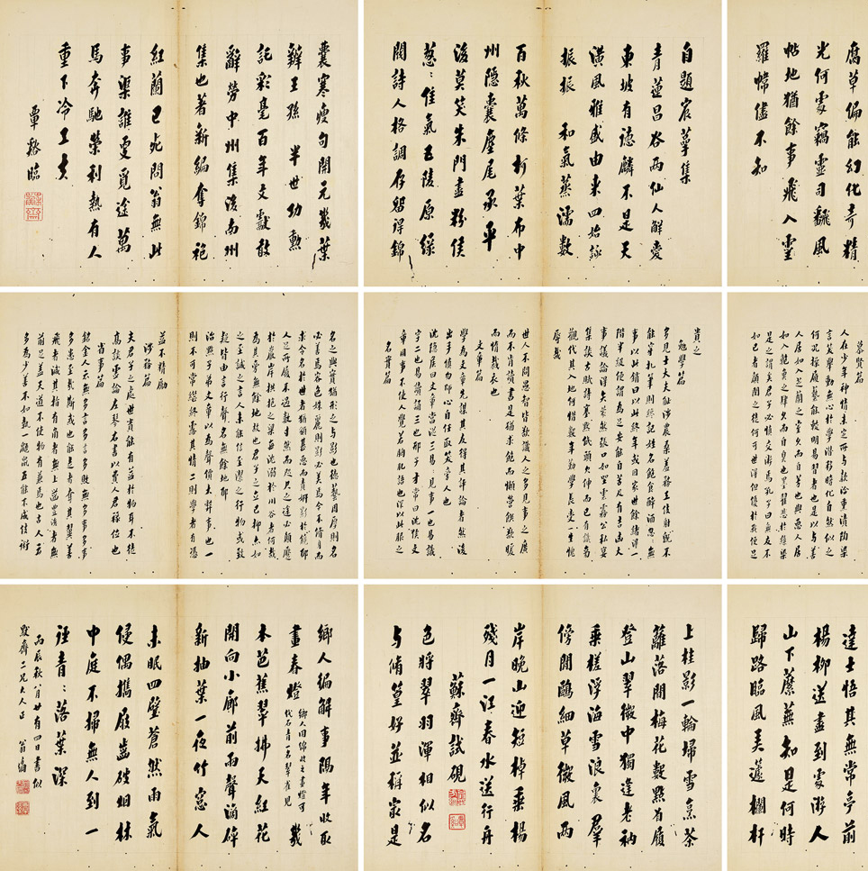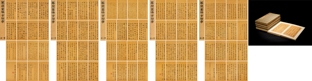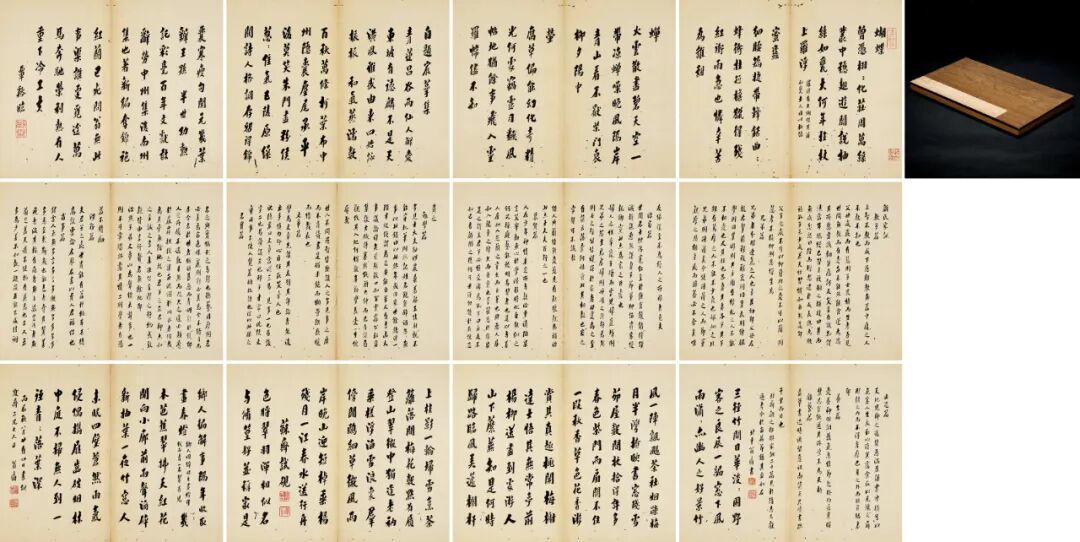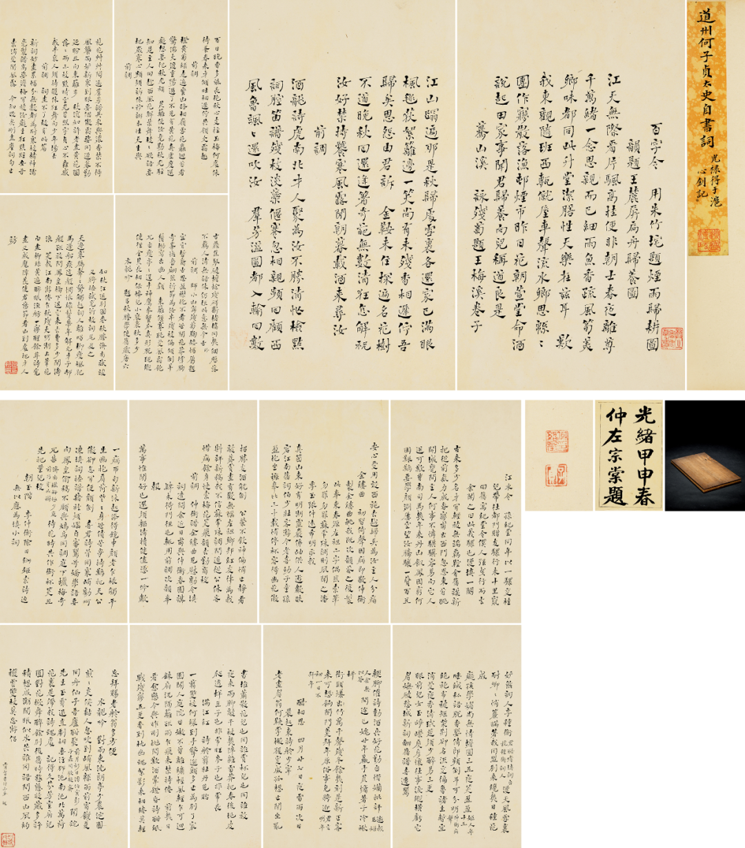 此册是何绍基抄录自作词十五首,未署年款,俱为小楷誊写,一丝不苟,极为精秀雅致。查钱松《何绍基年谱长编》,有“此年(1856)冬填词多首,并与嵇春源、李仲蘅等人讲求词律。如《贺新凉》云:旅居寂寂,忽想填词,嵇春园山长见示万红友《词律》,阅其凡例,知与我同一门外也,漫填二阕请教。其《金缕曲》亦云:仲衡谱《金缕曲》见慰,劝令填词遣闷,余近日甫与仲衡、春园讲肄,未得门径也,辄用前调次韵奉报。与善化人余棨(芰香)多有往来。余氏多次馈筍,并送牡丹。”又“此月(1857年五月),曾寄济南家书。案:此信札原无标题,《何绍基黑迹》署为《致何庆涵家训》,今年何庆涵同行至京师,故《顾先生祠会祭题名弟一卷子》于今年顾亭林生日祭及秋祭中均有提及,《何绍基墨迹》之标题有误”。《自作词册》均抄录了以上诸词,多刊于《东洲草堂诗钞东洲草堂诗馀东洲草堂文钞》,清同治六年(1867)长沙无园刻本。且册后有“五月七日书于三弟”的记录,故将此册创作年代定于填词时间(1856年冬)之后,寄济南家书同时,即1857年五月较为合理,而《何绍基黑迹》署为《致何庆涵家训》信札,标题当为《致何绍祺函》。何绍祺(1801-1868),字子敬,号勗潜,何绍基三弟,道光十四年(1834)举人,官至浙江道员。后人评价子敬“书法平原(颜真卿),能承家学”。