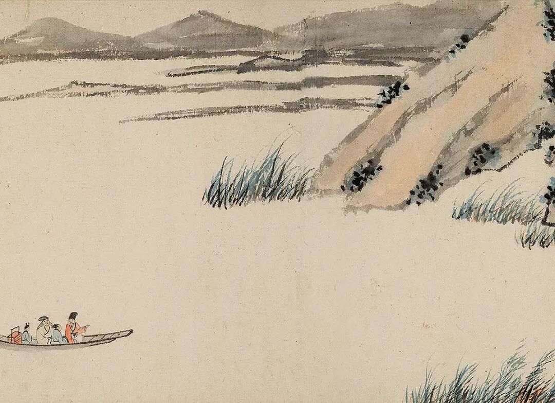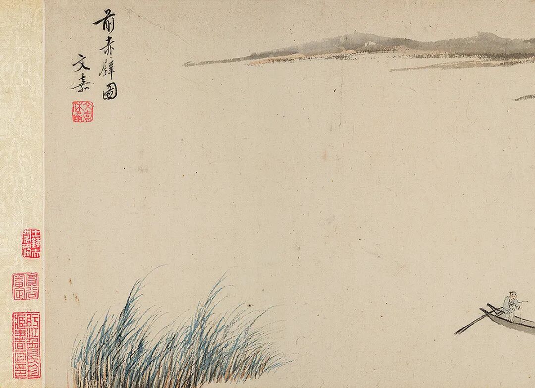 文嘉绘此卷“前赤壁图”取景山脚及江面,险峻石壁仅露一隅观之,壁间草木丰茂,倒悬而下。留白处即为平静的江面,在岸汀浅滩间写出数丛芦苇,芦苇给人带来秋天的季节感,经风不折,经雨不弯,其线条劲健有力,皆向右首摆动,以示“清风徐来,水波不兴”之感。笔墨师法黄公望、倪云林,雅逸有书卷气。画面展开,在石壁和草木掩映下,山间有清泉泄入江面,撞击山石,似有叮咚水声。“山间明月”在天,虽因画面视角而不可见,但观者亦可想象补白此中之意。赤壁渐远,芦苇更盛,留白的江面豁然开阔,远山淡墨染就,水天浑然一色,宛然“白露横江,水光接天”之境。江面现出一叶扁舟,中有五人,一名船夫摇橹,双丫髻者伺弄食盒,余者三人,戴冠者一人乃东坡,披巾帻者为客人,仿佛正在问答谈论:“纵一苇之所如,凌万顷之茫然。浩浩乎如冯虚御风,而不知其所止;飘飘乎如遗世独立,羽化而登仙。”