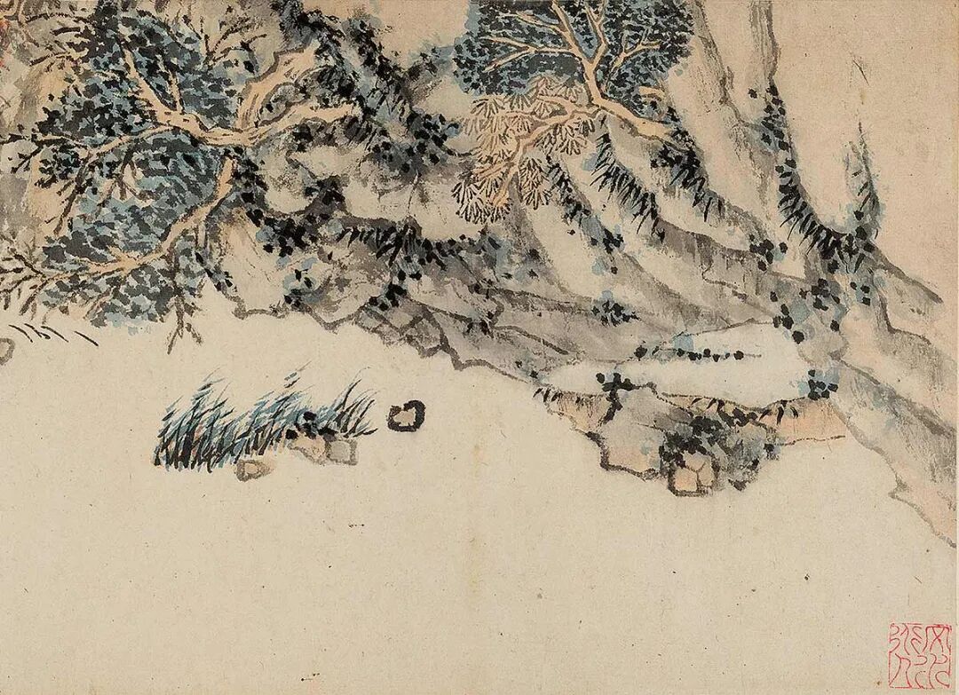 文徵明是继钱选、赵孟頫之后对青绿山水画法进行尝试、改革的画家。《金山图》这一路的青绿山水,是以赵孟頫的青绿法为宗,加强皴染的表现,笔致婉约柔和,并参入黄公望松秀的笔意,更加富有文人画的笔墨韵味。图中岩石、山坡、沙渚的笔法运用赵孟頫式的简疏披麻皴,在青绿的画法中糅进了浅绛的色调,只在坡石顶端略微罩染,色感淡洁,属于小青绿格式。这反映了文徵明有意识的将青绿与浅绛进行调和,追求与浅绛同一的清雅淡逸的艺术格调。文徵明《金山诗画合璧卷》局部