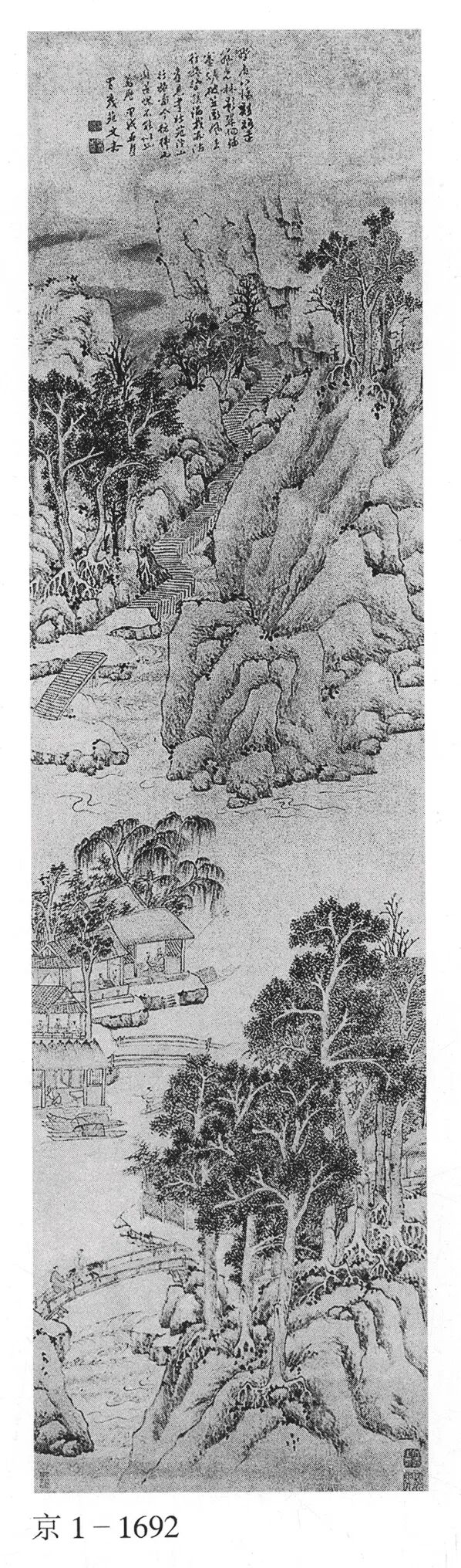 文徵明门下弟子众多,陈淳之后,除子文彭、文嘉外,陆师道、周天球、王稺登、皇甫兄弟、陆治、钱榖等等均有书画之名。《王稺登年谱》记:“(王稺登)1555明世宗嘉靖三十四年乙卯,廿一岁,此年王稺登为文徵明弟子,时文氏86岁。(见于《文徵明集》附录三《年表》)”王稺登书风学文徵明,“瘦不露骨”,至万历后期文氏与弟子或殁或老,于是稺登便以“遒美不凡”成为吴门书派的殿军。钱谦益《列朝诗集》云:“百谷(王稺登)振华启秀,嘘枯吹生,擅词翰之席者三十余年。文徵明故后,王能继其风雅之道,主吴中文坛30余年。王稺登颇有影响的《吴郡丹青志》以“志”的形式,对明代苏州画家分别品评,各为传赞。内有神品志记1人,沈周;附3人,沈贞吉、沈恒吉、杜琼;妙品志记4人,宋克、唐寅、文徵明、张灵;附4人,文嘉、文伯仁、朱生、周官。亦可见王稺登对文嘉画作的了解和认可。在存世画作中,多有王稺登与文嘉唱和或王稺登题跋文嘉之作,如辽宁省博物馆藏文嘉《水亭觅句图轴》,王穉登七言诗题:“飞萝秀木野人家,斜日虚亭一片霞;石壁四时雷雨气,深山大泽有龙蛇。王穉登。”汪砢玉《珊瑚网》卷四二记载文嘉《蛱蝶图》,王稺登评曰:“文休承作《蛱蝶图》,萧远高逸,非近世丹青之士所得梦见也。同时题咏俱濯濯名流,今不可复见矣。此扇出人怀袖,仿佛犹生蘑卜香也。”故宫博物院藏文徵明《湘君湘夫人图轴》,画幅中还有文嘉、王穉登二跋。而且,王稺登的女儿嫁给文嘉的儿子文元善(字子长,号虎丘,1554-1589)(见《文徵明传》),二者为儿女亲家,王稺登在为文元善所作的墓志铭中称其“画品第一,诗品第一”,以上资料可知,王稺登与文嘉是友情深重的,对文嘉画作风格也应该是有着透彻理解的。
