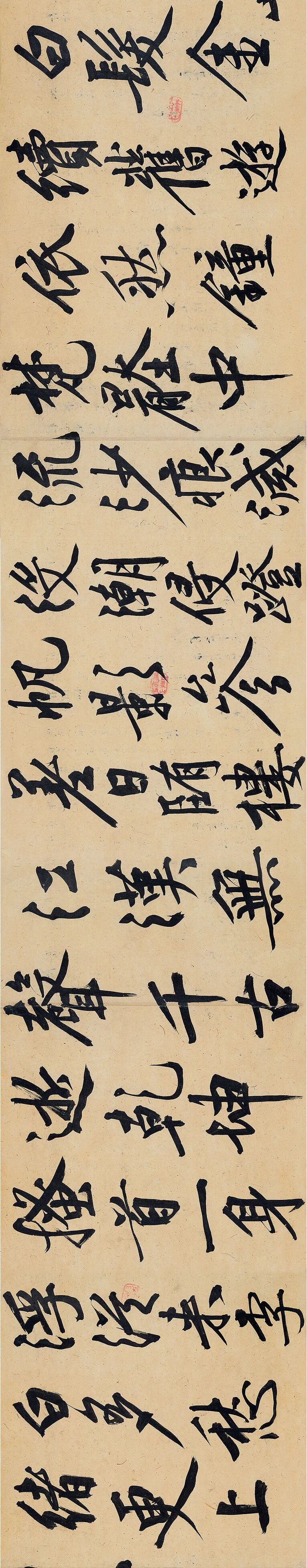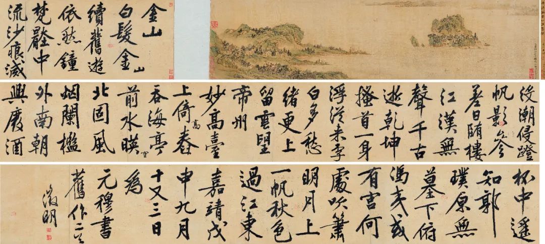《金山诗画合璧卷》是文徵明书画合璧卷,书法部分长达五米多,以黄庭坚笔意写行书,每字如拳大。款云:“嘉靖戊申九月十又三日,为元穆书旧作二首。徵明。”可见书于1548年文徵明79岁时。