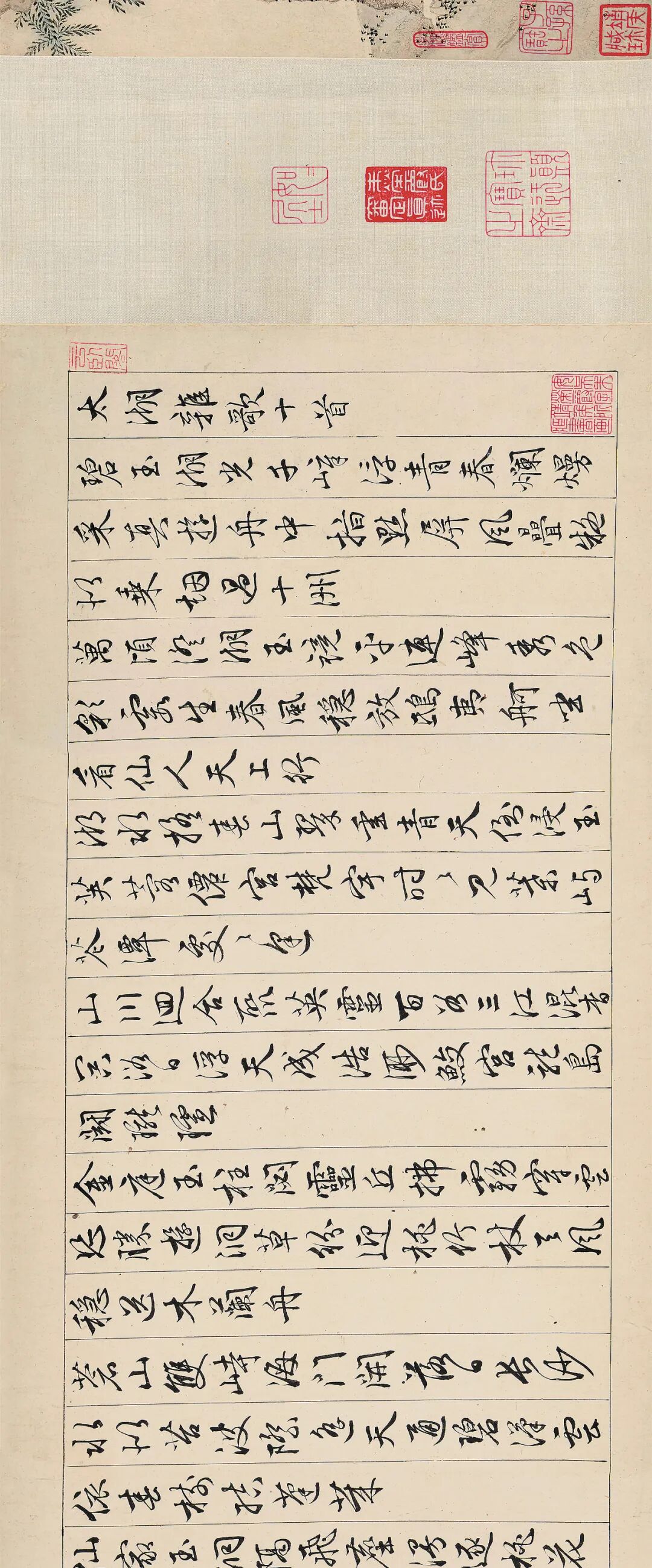 估价:RMB 6,000,000-8,000,000诗文著录:文徵明著《甫田集》卷八,第7页,国家图书馆藏清康熙间刻本。1.此作书法用纸为金粟山藏经纸,同一时期书风及用纸可参见台北故宫博物院藏文徵明《自书诗帖》卷(1550年作)。2.此作为爱新觉罗·胤禵、吴永、陈半丁鉴藏。吴昌硕、吴永题签。3.爱新觉罗·胤禵(1688-1755),清朝宗室,康熙帝第十四子,雍正帝同母弟。初名胤禵,康熙四十五年(1706年)左右改名胤祯。康熙五十七年(1718年)作为抚远大将军领兵出征,驱准保藏,为西部边疆的安宁作出了重要贡献。胤禵虽为雍正帝的同母弟弟,但他却是以胤禩为首的八爷党重要的一员,所以雍正帝胤禛登基后将胤禵召回京师,软禁于景陵,将其名中的“祯”改回“禵”,并与其他康熙皇子一起改第一字为“允”,称“允禵”。雍正四年(1726年)被圈禁于景山寿皇殿。直至乾隆帝弘历即位后,胤禵才恢复了自由,晋封多罗恂郡王。4.吴永(1865-1936),字渔川,一字盘庵,室名观复斋,浙江吴兴县人。为盛宣怀之女婿,工书法,学董其昌,著有《庚子西狩丛谈》。5.陈半丁(1876-1970),即陈年,浙江山阴(今绍兴)人。自幼学习诗文书画。拜吴昌硕为师。40岁后到北京,初就职于北京图书馆,后任教于北平艺术专科学校。擅长花卉、山水,兼及书法、篆刻。曾任中国美术家协会理事、北京画院副院长、中国画研究会会长。