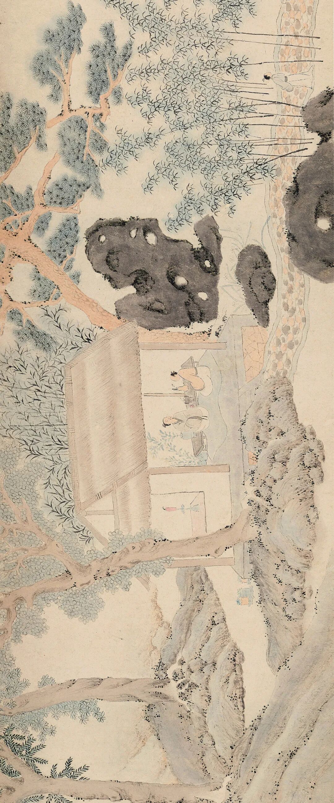 估价:RMB 5,000,000-8,000,0001.“玉斋珍藏明清书画展”,耶鲁大学美术馆Yale University Art Gallery,1994年4月9日-7月31日。2.“玉斋珍藏明清书画展”,密歇根大学艺术博物馆University of Michigan Museum of Art,1994年9月10日-11月19日。3.“玉斋珍藏明清书画展”,香港中文大学文物馆,1994年12月16日-1995年2月25日。4.“玉斋珍藏明清书画展”,斯宾塞美术馆Spencer Museum of Art,1995年4月9日-6月18日。5.“承古融今 星汉灿烂——中国嘉德艺术品拍卖20年精品回顾展”,中国国家博物馆,2013年11月12日-30日。1.班宗华编著《玉斋珍藏明清书画精选》,第99至101页,耶鲁大学美术馆,1994年。2.《嘉德二十年精品录 古代书画卷·一》,第89号,故宫出版社,2014年。3.田洪编著《王南屏藏中国古代绘画》上,第96至97页,天津人民美术出版社,2015年。4.《承古融今 星汉灿烂——中国嘉德艺术品拍卖二十年精品回顾展》,第26号,中国艺术出版社,2015年。著录:王季迁、孔达编《明清画家印鉴》,“陆师道”第5、8、10印,商务印书馆,1940年。1.此作经蛟川马氏、吴子深、朱靖侯、林尔卿、王南屏鉴藏。吴曾善题签。2.“蛟川马氏珍藏、汉庐珍藏”虽不知何人,但其藏有陈淳《溪山泛舟图卷》(南京博物院藏)、文嘉乔林清影图(辽宁省博物院藏)等名作,可见其赏鉴之精。3.吴子深(1893-1972)原名华源,号桃坞居士,江苏苏州人,家为吴中望族,收藏宋元古画甚富。吴氏与吴待秋、吴湖帆、吴观岱有“江南四吴”之称,与冯超然等有“三吴一冯”之称。4.朱荣爵,字靖侯,安徽泾县黄田人,精鉴别,富收藏,民国时期著名收藏家,与吴湖帆、张葱玉等互有往来,陈巨来曾为其刻“子孙保之”、“珍颠宝迂之斋”等收藏印。5.林尔卿,宁波人,曾任明华商业储蓄银行董事,书画收藏显著,与赵叔孺、吴湖帆等友善。《吴湖帆日记》中常有提及彼此过从斟酌书画。王季迁与孔达编《明清画家印鉴》中陆师道的三方印鉴即取自此作,时为林尔卿收藏。6.王南屏(1924-1985),号玉斋,是20世纪中国书画主要收藏家和鉴赏家之一。二十岁时,王南屏已经购入自己第一批画作。叶恭绰为其引荐上海知名艺术商,现藏于北京故宫博物院的米友仁《潇湘奇观图卷》便是当中之一。他的藏品所代表的文人画传统的历史,是20世纪以来最重要的私人收藏。7.吴曾善(1890-1966),吴郁生之侄,字慈堪,号小钝,江苏元和(今苏州)人。曾任东吴大学教授,后为上海文史馆馆员。对古字研究甚深,能以甲骨文字作书成联,颇有功力。玉斋主人王南屏旧藏文嘉《洗竹山房》一卷,绘坡脚溪水之畔,有幽静庭院,门前流水潺湲,客过石桥,细篱宅门处,主人拱手迎宾。庭中广植林木修竹;沿蜿蜒石径,一士顾盼,身后童子捧书随行;室中二士,或为主人,或为宾客,相谈似久,更或是期待良朋,共叙佳话。是图斋堂明净,侧有湖石盆栽,小室高烛待烧,以备通宵畅谈。文嘉侄孙文震孟在《长物志·山斋》中写道:“宜明净,不可太敞。明净课爽心神,太敞则费目力。或傍檐置窗槛,或由廊以入,俱随地所宜。中庭亦须稍广,可种花木,列盆景”,所论与此图描绘之景殊为契合。斋室内外的陈设,处处显示出山房主人的闲情逸趣,身后几上摆插花、香盒、香炉、香瓶(内放香筷、香铲),几下两瓶插花,其闲情雅致,高朋雅集之状,一脉江南文人雅士生活之状。全卷浅绛设色,用笔松散,一派含蓄蕴籍、萧散淡然之气,为文嘉极精之作。文徵明的弟子门生众多,受文徵明影响的文氏后裔中,如文彭、文嘉、文伯仁、文元善、文从简、文震孟等人皆为能书善画者。在这些后人中,文嘉最有乃父风范,加之一直作为项元汴收藏书画的顾问,所以他在吴中文人群体内中有着极高地位,也因此,文嘉的绘画不仅继承了文徵明的衣钵,更为重要的是,从古人处汲取的传统,使其更上一层楼。但是,文嘉受文徵明“隐逸”思想的影响,在面对屡试不第,官闲职冷的仕途时进而潜心绘艺,畅意山水,悠然自得。他与同样绝意仕途的唐寅作诗唱和,写道:“人生万事何足问,但愿有酒常花前。世人妄想慕富贵,不知富贵多前缘”。他还曾作《白燕》一诗以示自己对功名的不以为意:“也知自惜奇毛羽,不向朱门汗漫飞”。隐居之后的文嘉,如同本卷描绘的《洗竹山房图》类似,雅集、访友、纪游、卜居等等成为其主要活动,由外部繁杂生活转向内心的安静。由宋代出现的生活四艺——焚香、点茶、挂画、插花,这些皆为当时文人雅士平日修身养性的课题,在文嘉身上充分的发展起来,追求精致的生活方式,将生活审美化,审美生活化,显示出与大众不同的高雅趣味。如其在嘉靖四年偕同好前往惠山只是为观摩王绂的书迹,游玩惠山之余,汲泉水烹茶,后忆品茶之情境,作《惠山图》卷。本卷《洗竹山房图》中,在文人的雅集生活场景中,重点描绘的焚香、插花、以及旁边的盆栽,都是其安闲舒雅生活的外射,虽然以长枝的花卉插在胆瓶,但这种热情恰恰说明了其内心对此时生活的肯定。《洗竹山房图》卷作于“万历戊寅”,即1578年,时文嘉78岁。此作可称是其晚年用心之作,近似的风格还可参见北京故宫博物院所藏文嘉于万历甲戌(1574)所作《溪山行旅图轴》、万历己卯(1579)所作《夏山高隐图轴》,其山石树法极为一致。![]()