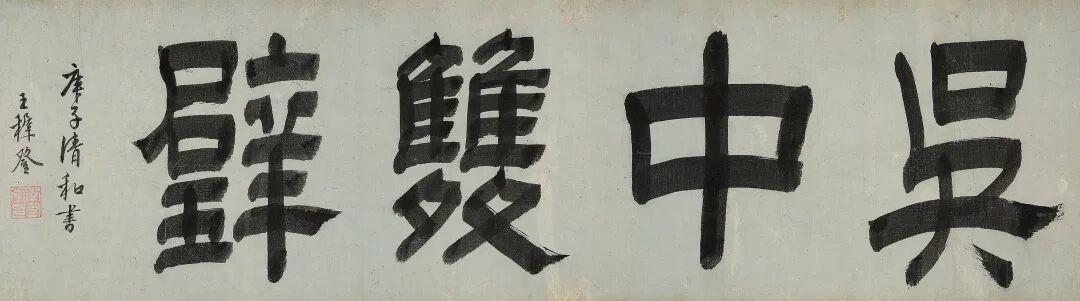 该手卷引首王稺登题大字隶书“吴中双璧”,为典型明中后期隶书风格。“吴中双璧”意既指此卷文彭之书、文嘉之画可称良璧,亦指文彭、文嘉兄弟二人皆为“璧人”。该卷无年款,钤文嘉之“文嘉休承”、“文水道人”二印,文彭“文彭之印”、“国子先生”二印,其中,文嘉之“文水道人”印参见上海博物馆藏1571年文嘉跋《祝允明草书李白诗卷》用印;文彭之“文彭之印”、“国子先生”印见于上海博物馆藏陆治、文彭1570年合作《赤壁赋书画合卷》文彭所书“后赤壁赋”用印。卷中文嘉《前赤壁图》部分可参见台北故宫博物院所藏文嘉于隆庆六年(1572)《赤壁图并书赋》卷,其中山石、林木画法颇多相合之处;