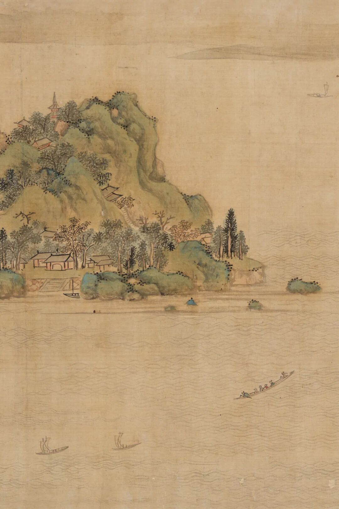卷中《金山图》为文徵明于后一年己酉(1549)仲秋补图,此处年款作者误书为“时年七十有九”,应为80岁作。《金山图》以文雅秀逸的画风,描绘了金山一峰中立之奇境。图卷采用平远构图法,画中江水茫茫,微波荡漾,金山如浮玉飘浮在波涛之上。远处沙渚起伏,江上舟楫点点。山色青碧,上面有一栋栋画檐朱宇。巍然耸立在金山之巅的慈寿塔,更增添了金山寺的美丽秀色。在金山的东面,画镇江城郊一角,船桅、村舍、城墙隐现于山坳之间,意境开阔,引人入胜。
