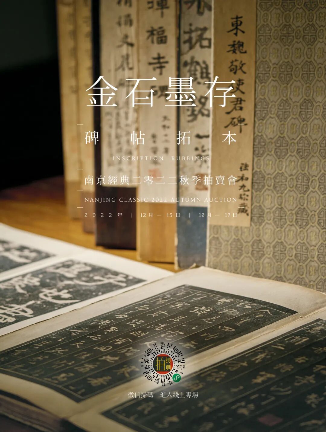 南京经典2022秋季拍卖会持续推出“古籍善本”专场,共计48件拍品。与以往不一样的是,本次拍品皆受托于同一藏家,并且大部分以碑帖拓本作品为主。所说碑帖拓本,是指各种石刻、木刻文字的拓本,是诸多收藏品中的一个大类,也是文化传承中的重要一脉。