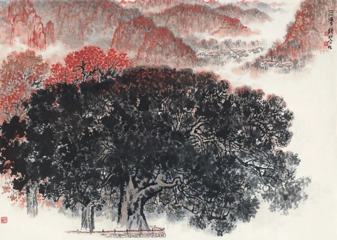 钱松嵒先生常以“一树成图”,对传统经典图像进行大刀阔斧的个性化改造,创造出造型雄奇的“钱家松”。是幅《三湾》,为钱松嵒创作转型期作品,可现其画风已变。三湾,地处江西永新。1927年,著名的“三湾改编”后,明确了党对军队的绝对领导,首次宣布并执行“三大纪律”,深得人民群众拥护。在三湾,钱松嵒看见了秋收的美景、百姓的新居、村中的学童,翻天覆地的变化,给钱松嵒的创作带来了激情和灵感。此作《三湾》,笔墨活润,松厚老辣,设色更是标新立异、别出心裁,朱砂点染若赤霞,浓墨点厾铸古柏,黑、白、红之色彩对比,带来强烈的视觉冲击力,烘托出气势磅礴的革命激情——是中国山水画领域令人击节称绝的色彩创新,是为经典。