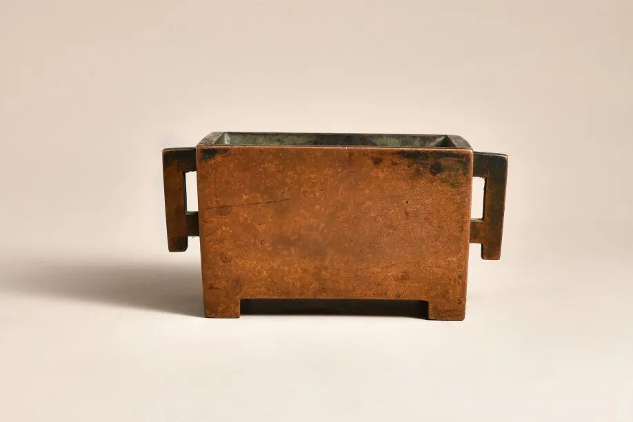 观此炉原铜包浆,年久温养,为自然天成之腊茶色,赤色蕴黄,洁银藏紫,赤铜也。文房之炉,多细精小,马槽之炉,历来为文人崇尚,订制如此大器者,必为大家之用也。细察斯炉,宽长合度,高低适中,双耳谐称,四足规矩,刚正方圆,仪规森然,流线平行,尽显工艺。底刻“孝必能忠”四字篆书体,字峻底平,稚正章均,精妙之款也。《孝经·广扬名》曰:君子之事亲孝,故忠可移于君。古人认为一个人在家侍奉父母能尽孝,那么他对国家对君王也一定能尽忠。指由孝敬父母即可判断一个人能精忠报国。这确乎为“忠孝合一”之典型言辞,在“君父合一”的人伦关系中,将“忠孝合一”的道德关系也更加确定,堪称订制作器也。