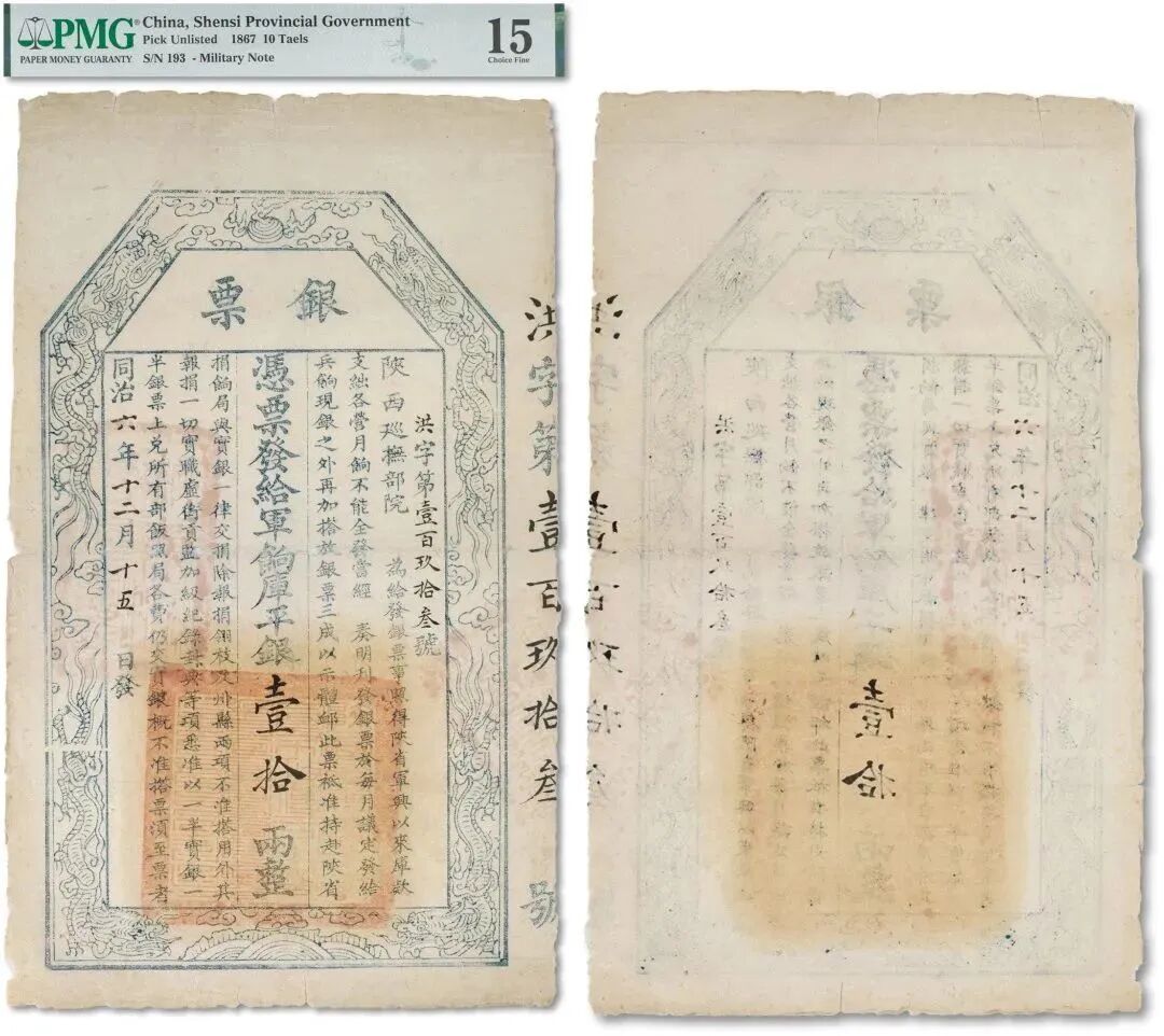 此件同治六年陕西巡抚部院军饷拾两银票,作为当时的一种金融票证,银票设计风格独特,发行背景特殊,是当时清军镇压西捻军之兵饷,发行时间极短,不到半年就停止发行并收。这张银票也是同治年间政府唯一发行的银两票,是研究清晚期陕西地区社会经济极为重要的金融实物,具有重要的历史价值。这种左宗棠以陕西巡抚部颁发的军饷银票堪称为“中国第一种军用票”,是中国清代钞票之鼎级大珍品,极为罕见,弥足珍贵。且此壹拾两面额目前存世仅见三张,其中一张由上海博物馆所珍藏。