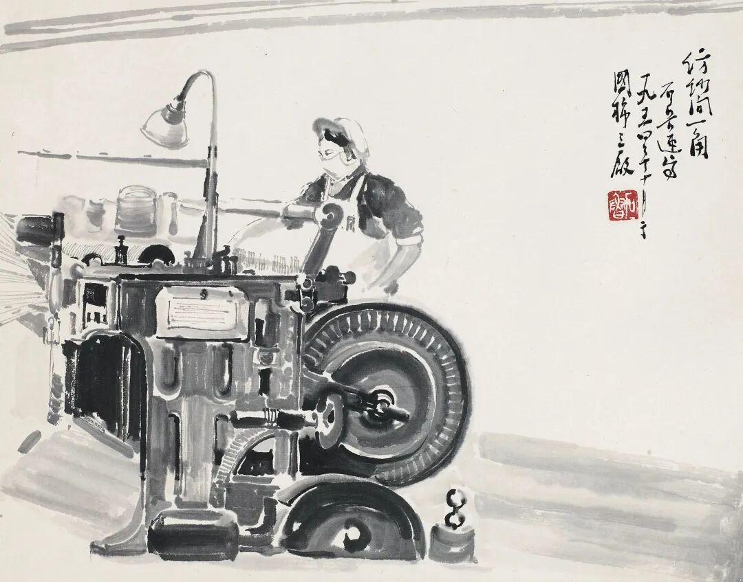 款识:纺纱间一角。石鲁速写。一九五四年十月,于国棉三厂。