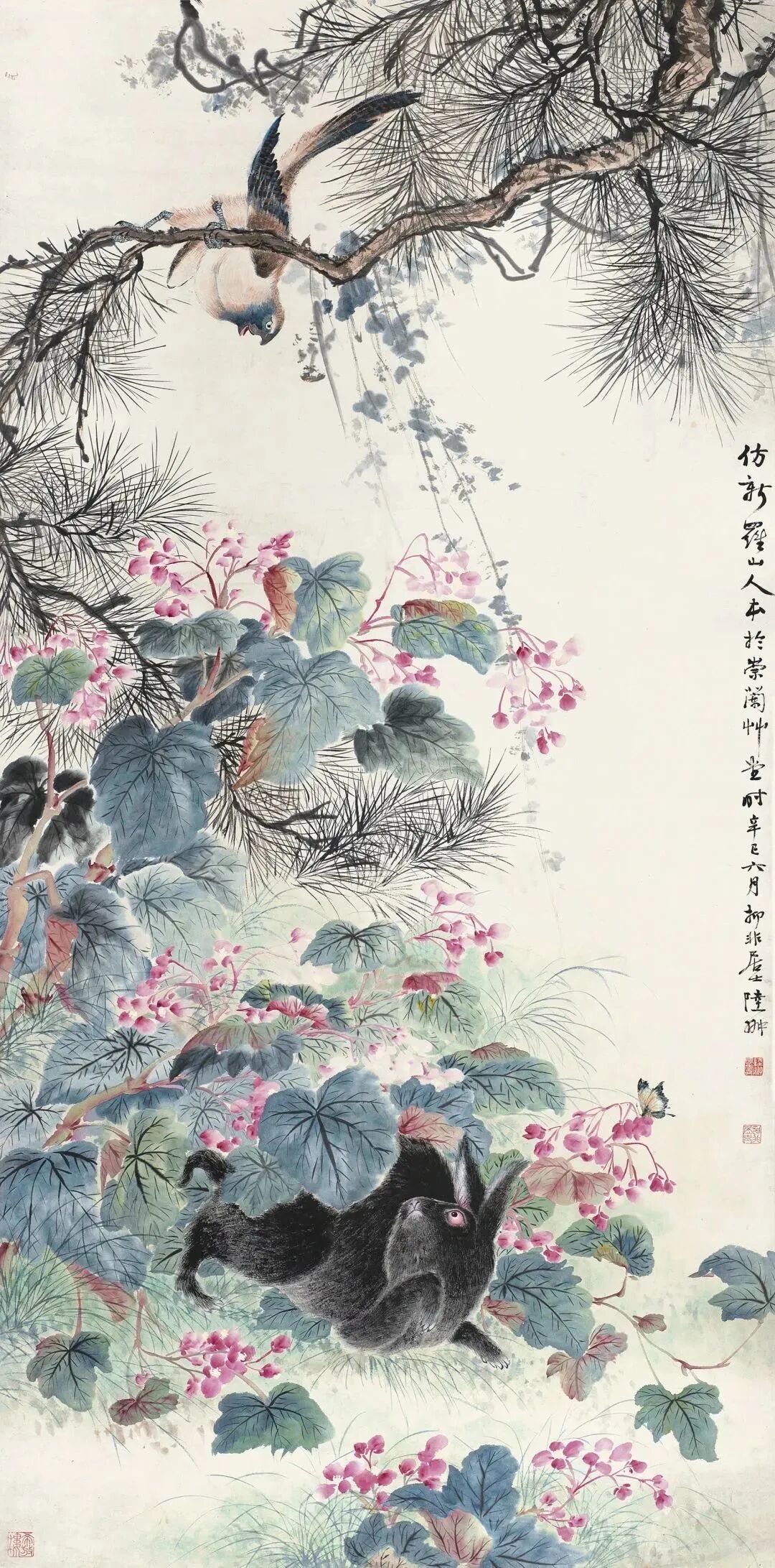 “四大花旦”的出现为近代花鸟画注入了一股“雅而新”的力量,明丽的色彩、生动的造型深受普通大众的喜爱,对于传统的继承又保留了笔墨的趣味,因而也被精英文化阶层所接受。陆抑非习画初随李西山、陈迦庵,后入“梅景书屋”吴湖帆门下,其画先得传统,又吸收了西画的写生法、用色法,所作花鸟细而明快,艳而不俗,工而不滞。笔墨生辣朴茂,而不失清丽典雅之韵味。