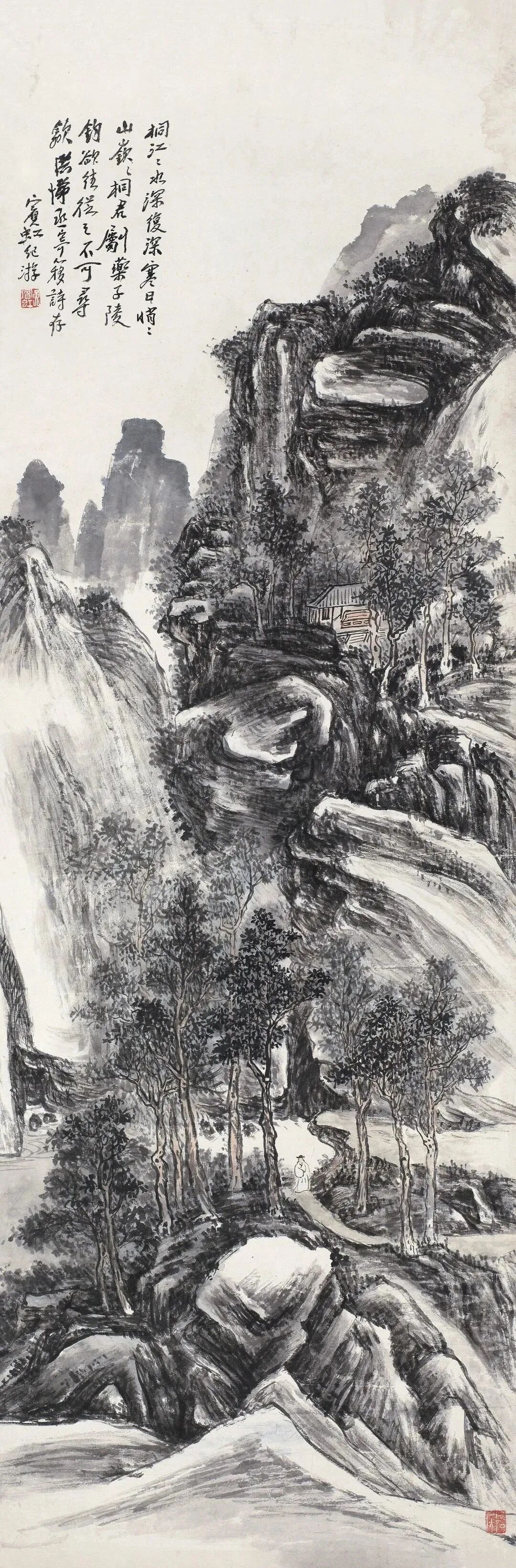 款识:桐江江水深复深,寒日悄悄山嵚嵚。桐君药子陵钓,欲往从之不可寻。歙洪悌丞寄簃诗存,宾虹纪游。