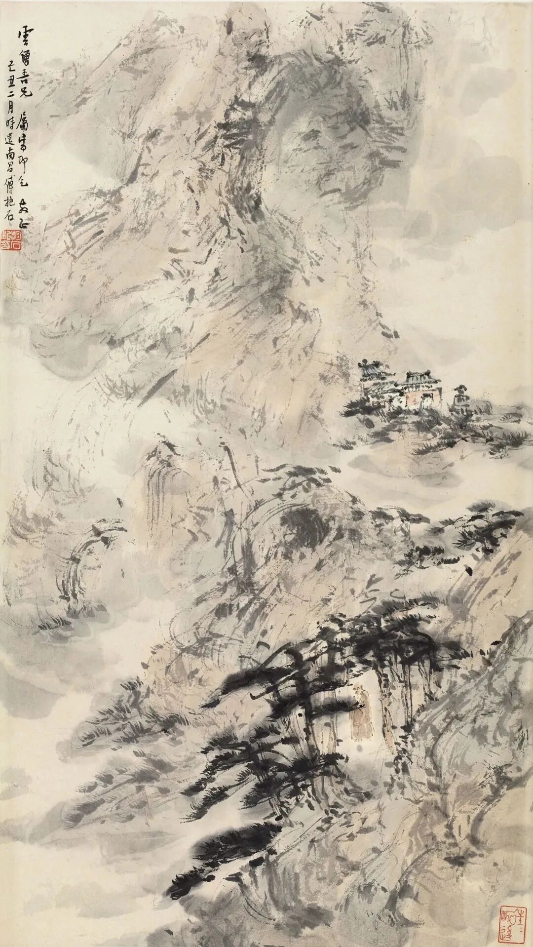 1948年底,由于战事激化,傅抱石一家撤出南京回到家乡南昌。翌年二月,于青年会举办画展,作品有百余件,反响热烈。这个时期是傅抱石山水风格完善至纯熟境地的阶段,而此幅《深山古寺图》是傅抱石先生1949年二月在南昌精心绘制的一幅山水佳作。由于局势动荡,傅抱石此年作品不多,流传至今者更稀少。其中“往往醉后”印章仅用于画家自己的得意之作,足可见画家自矜之情。作品多以墨法表现,设色较为清淡,很好的将墨与色相融合,体现出淋漓酣畅的意趣。所画丛树笔墨老辣,打破了中锋和侧锋用笔画树传统的笔法,而是将笔锋散开,下笔如风驰电掣,纵横交错,随势而动,表现出强烈的艺术个性。画面山寺浮云,松林敞幽,僧人藏身于山腰之际,见避世遁隐之志。画如其人,境由心生,笔下流露的是画家在时局未明时心情的写照。