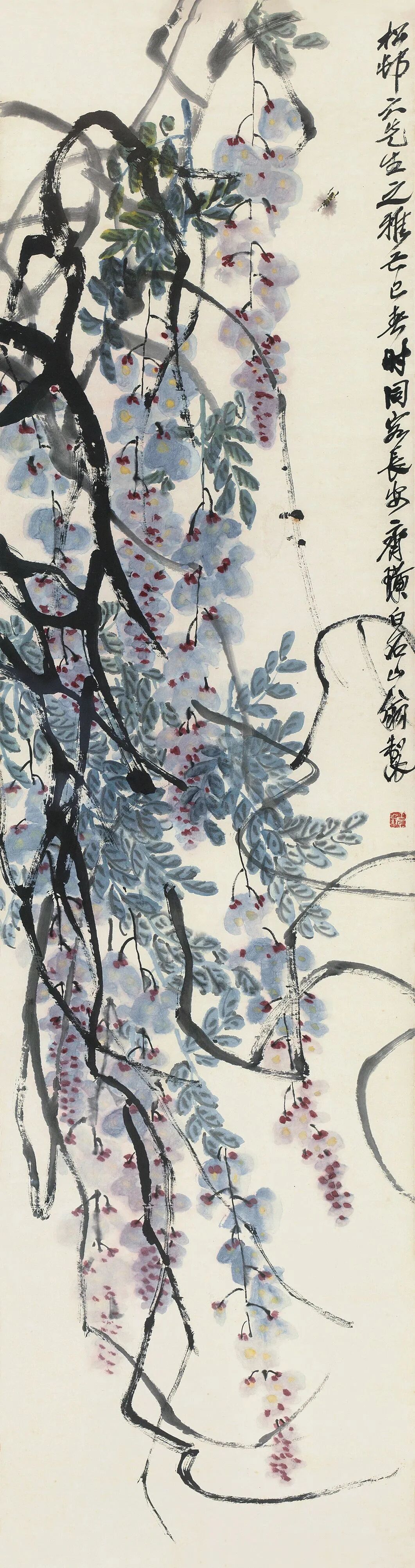 齐白石画藤,早年近徐渭,用笔飞动,1925年前后,向吴昌硕浑厚之风靠拢,但他清健的笔路与吴昌硕的重拙不同,经过多番尝试和锤炼,才终于确立了自己生动鲜活、浓淡得宜的藤萝画风。胡佩衡、胡橐父子合写的《齐白石画法与欣赏》中记载,“老人六十岁时认为画藤的功夫很差,特别在章法上最差,所以每天要练习创造不同构图的藤萝小稿。”紫藤是白石老人常画的题材,他笔下的藤萝,大致是南方花叶并盛之藤,虽然他曾到中山公园看过先开花后长叶的北方紫藤,回来画了一幅,但由于没有藤叶掩映而“太费经营”,因此还是归原貌。此幅便是老人笔下的南方之藤,藤花饱满光润,藤叶相依有致,设色清丽典雅,笔墨温润清新。其间藤蔓缠绕飞舞,以焦墨挥就,起到了稳定画面的作用,与花朵的恬静秀美形成了强烈的对比,从中可以感受到白石画藤的变法的探索之路。