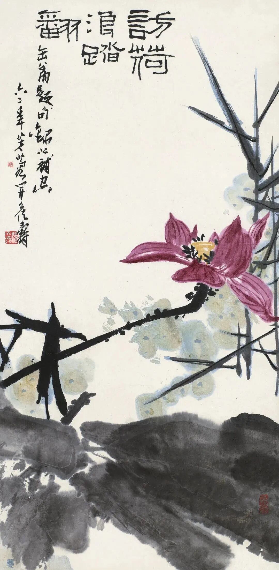 此《疏池暗香》的整体风格、独特技巧和落款年代,无不显示出这是张大千由集古期向化古期迈进的力作。张大千在此时期还尤为重视书画关系,他曾说:“画荷花的竿子要用篆书,叶子则是隶书,瓣子就是楷书,水草则用草书。画荷需用正、草、篆、隶四种书法技巧。”若以此言观此画,便发现其所言非虚。整幅画作架构自然忘形,用笔古朴疏狂,泼墨淳厚飘逸,格调清新典雅,尤其是纯熟的功底与老辣的技法,于浑朴中见清秀,于洒脱中含缜密,于酣畅中寓意蕴,令人折服。