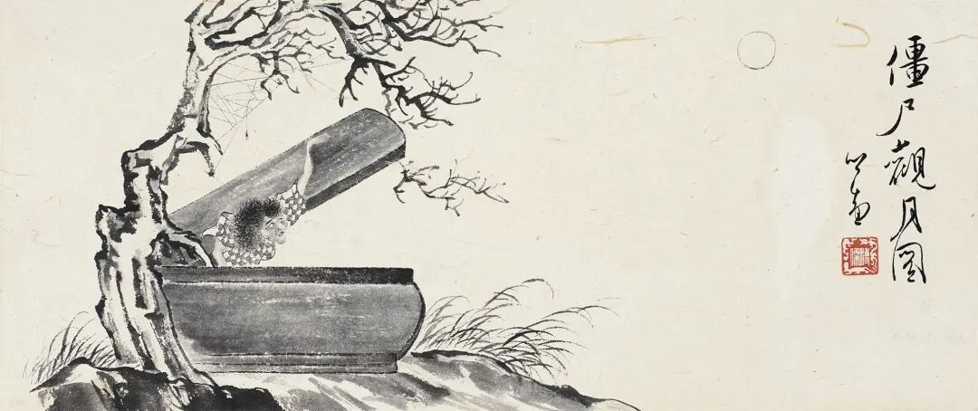 鬼灵精怪与钟馗也是溥儒喜好的题材。溥儒喜好此一题材,一方面是达“藉鬼讽今”之目的,二方面则是“游戏笔墨”的幽默小品。幽默画风使得鬼灵精怪在他的笔下格外生动有趣。细观这幅《观月图》画的真是前无古人后无来者,看这棺材里探出的僵尸先生,竟还烫着爆炸卷头,身穿LV同款棋盘格子T恤,手举棺盖的动作既生动又滑稽,同时也寓意升官发财之祥兆,可以说是时尚圈的一朵奇葩了。背后一颗树上,蜘蛛于蛛网蛛丝垂下,蜘蛛在民间又被称为喜蛛,故此画又有“喜从天降”之寓意。画面右侧一轮明月当空,正代表中元时节,济度六道苦难,以及报谢父母长养慈爱之恩。