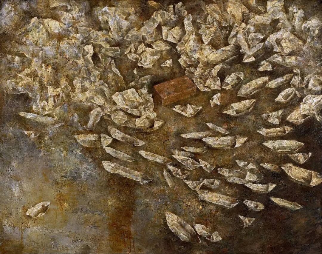 签名:TTRRVE 1997;《不沉的纸舟》140×180 cm 布上油画 1996-1997 陈文骥(画背)