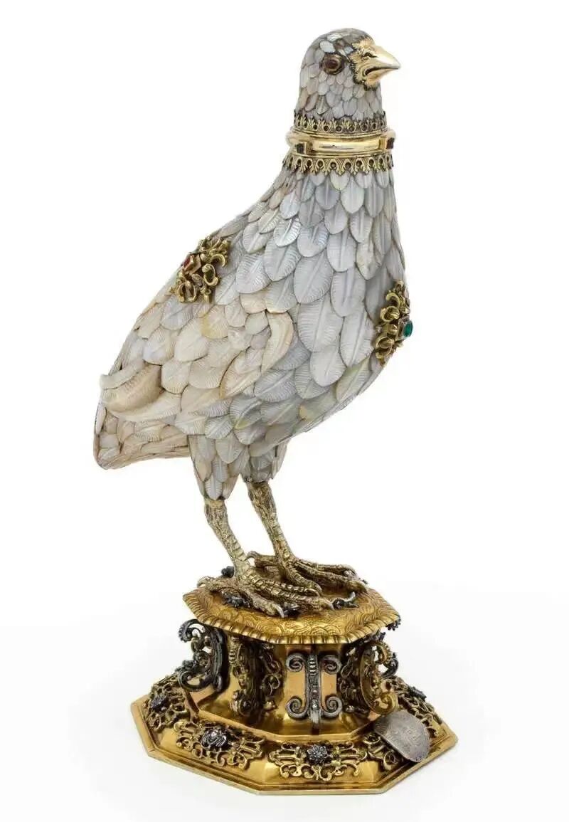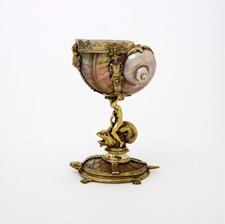 16世纪,黄金和珠宝制品常常选用具有异国风情的奇珍异宝装饰,包括水晶、鹦鹉螺壳和鸵鸟蛋等,显示出当时跨越全球的文化交流。这件器物上的海螺来自澳大利亚和东印度群岛附近的水域。其外壳经抛光后,在表面施上金银,鹦鹉螺杯更是珍稀物品,欧洲王室人人都想拥有。
