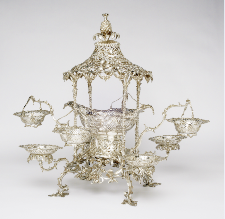 这件多层银饰盘,将东方建筑形式与洛可可装饰风格交织结合,妙趣生辉。器物整体呈中国宝塔样式,器物顶部用菠萝装饰。菠萝在当时的欧洲十分稀少,因此是财富的象征。自17世纪末以来,菠萝造型一直流行于建筑物和装饰性艺术品中。