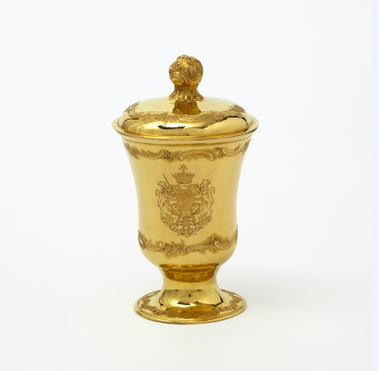 这件金杯中间饰有盾形纹章,是当时俄国皇室最中意的风格类型,推测可能是为纪念谢列梅捷夫伯爵被任命为俄国最高级别陆军副官而特别定制,并由俄国女皇亲自赠予。