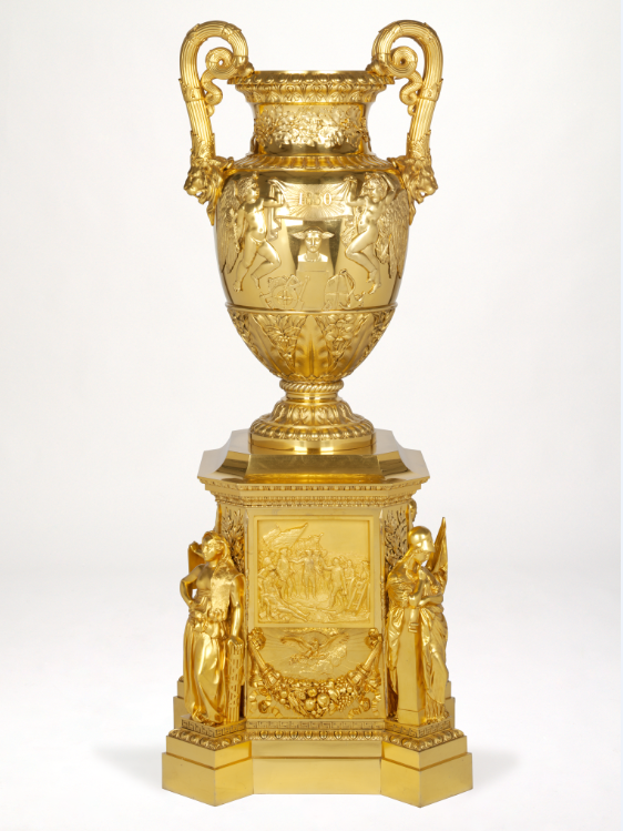 这件器物是法国政府为纪念战功卓著的拉法耶特侯爵而特别定制的。拉法耶特侯爵曾参与美国独立战争,并与美国总统乔治华盛顿结为好友,是横跨大西洋两岸的知名人物。瓶身以经典希腊元素彰显其英勇形象,饰有一尊代表名誉的半身像、象征艺术和工业的徽章标识、四个反映侯爵军队英勇形象的军事场景,以及四尊分别代表自由、平等、力量和智慧的雕像。