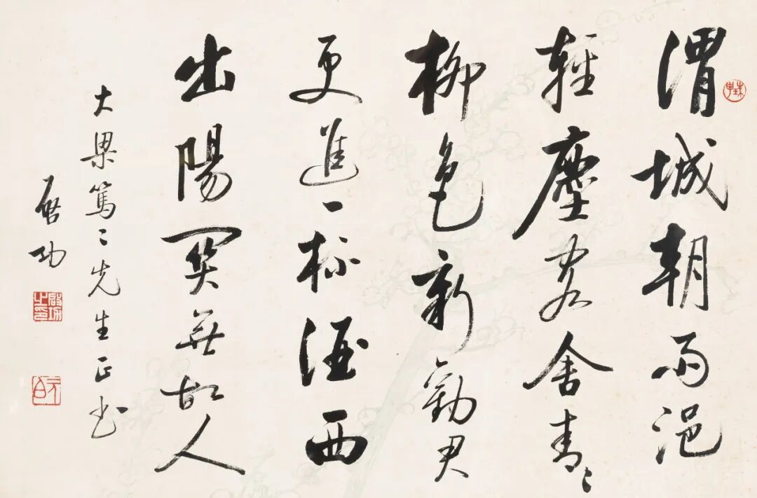 启功(1912-2005)行书 王维《送元二使安西》释文:渭城朝雨浥轻尘,客舍青青柳色新。劝君更尽一杯酒,西出阳关无故人。说明:大梁笃二(1925-2012),元新日本制铁常務。此幅作品为启先生书写的唐代王维的《渭城曲·送元二使安西》:渭城朝雨浥轻尘,客舍青青柳色新。劝君更尽一杯酒,西出阳关无故人。这首诗以自然的语言抒发别情,情景交融,具有很强的艺术感染力。赠送日本友人大梁笃二。纵观通篇有一种振振公子之气质,兼有一股旧时文士的情调。同时,笔法和结构上,外内敛秀整而内钢筋铁骨,瘦劲挺拔,骨骼分明,气派大,撑得开,外柔内刚、自然洒脱、清隽儒雅而妩媚华美”,堪称当代书法大师。