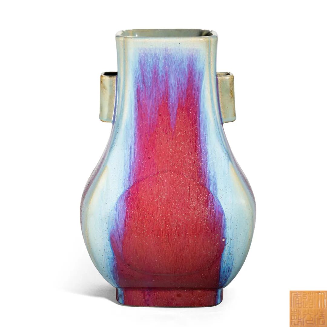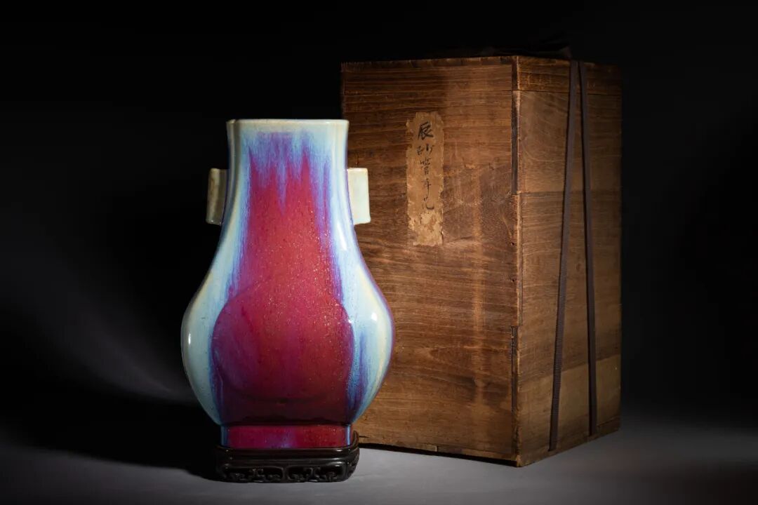 全场拍品涉及瓷器、玉器、珐琅器、金属器、佛教造像、竹木雕刻、古典家具、传统书画及古写经等,各门类精品荟萃。届时赵无极抽象代表作《黑色残像》、赵朴初行书《醉高歌过喜春来》、清道光 窑变釉贯耳方壶,以及罕见奇楠沉香等重磅拍品将集中登场,部分拍品更附有原始票据和刊载记录等资料,来源可考,传递有绪,是东瀛生货淘珍的绝佳契机,敬请期待。本品形制仿自汉代投壶,呈四方倭角形,颈部两侧对称贴塑贯耳,鼓腹,长方形圈足。足内施酱釉,底心阴刻「大清道光年制」款。通体满施窑变釉,釉质滋润肥厚,釉色主体为玫瑰红间月白色,色泽变化丰富,釉汁自器口向足部自然垂流,呈色丰富多阶,渐变自然洒脱,在月白釉色映衬下,尤显鲜艳夺目,斑斓异常。由于在烧造过程中釉易流淌,故在口沿、转折处会呈浅色调,而器身中央则是红色调。窑变釉为雍正年间仿宋钧釉所制,是以铜红釉为主,并添加多种金属元素烧制而成的高温釉,其釉汁流淌看似天成,实际其呈色规律已为当时窑工所掌握,从而塑造出艳丽华美的釉色。《稗史汇编》有云:「瓷有同是一质,遂成异质,同是一色,遂成异色者,水土所合,非人力之巧所能加,是之谓窑变」,为将含有不同呈色元素的色釉融于一体,高温烧成,釉料互相交融,自然流淌,呈现斑斓釉色,俗称「窑变无双」。其上乘作品乃是由口沿、转折等棱角之处至腹部釉面逐渐流淌,因此造成釉色由浅及深的渐变,釉色如雨淋墙般变幻。此件道光官窑沿袭了乾隆时同类作品的风范,釉色由月白至蓝再至粉红,融溶一体,条斑状色泽明显,红紫交融,蓝白相掩,纵横变化,无有穷尽,可谓变幻莫测,奇巧万千,给人一种变幻莫测、扑朔迷离之感。釉色之美,可谓窑变中上乘之作。配随形木座,更添典雅华贵,为道光官窑同类作品之翘楚。