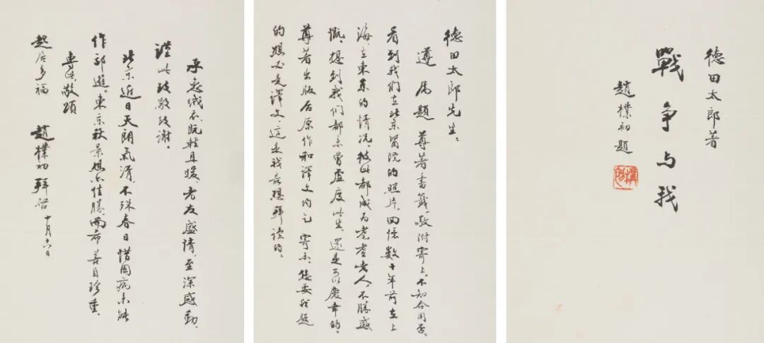 赵朴初(1907-2000)行书「战争与我」、致德田太郎书信一通尺寸:26.5×19cm×3,约0.5平尺(每页)释文:战争与我。德田太郎先生,遵属题尊著书签,敬附寄上,不知合用否。看到我们在北京医院的照片,回忆数十年前在上海,在东京的情况,彼此都成为耄耋老人,不胜感慨。想到我们都未曾虚度此生,还是可以庆幸的。尊著出版后原作和译文均乞寄示。您要我题的想必是译文,这是我最想拜读的。承惠绒衣,既轻且暖。老友盛情,至深感动,谨此致敬致谢。北京近日天朗气清,不殊春日惜因病未能作郊游。东京秋景想亦佳胜,而希善自珍重。专此敬颂,起居多福。赵朴初拜启,十月十八日。说明:德田太郎,1911年生于芦品郡阿字村。曾作为战地记者在外务省驻上海大使馆工作。是一位十足的反战主义者、和平爱好者。1941年同好友叶文津(曾用名叶德铭)保护巴金、田汉等在香港避难的中国同胞返回广东。后经好友李正文介绍,结识了当时同在上海工作的赵朴初,两人一见如故。虽然大家来自不同的国家,却有着相同的国际主义精神。在上海工作期间共同举办学习研讨会、组织青年活动。由此结下了深厚的友谊。归国后,二人仍如兄弟般交往甚密。此通信札是赵朴初先生写与日本好友德田太郎的,共计三页,第一页开篇明义,是赵朴初先生接受委托,帮助德田太郎的新书题写书签,随后为对往事的回忆,由在北京时二人的合影,再到回忆数十年前上海东京的过往,岁月匆匆感叹二人皆以致暮年,感怀一生光阴并未虚度。还诚恳的希望德田太郎在著作出版后可以寄来拜读。第二页讲到德田太郎给他寄的毛衣很舒适非常的感谢,北京此时气候宜人东京想必也是秋日盛景,互道珍重,起居多福。最后一页为赵朴初先生为德田太郎题写的书签《战争与我》。从此通信札中可见赵朴初先生对老友的思念,也表现出赵朴初先生是一位学养深厚的学者,为人儒雅恭谦,忠厚善良,和蔼可亲,书法水平更是一流,并且受人尊敬。虽是日常的通信,但兴文间见规整雍容的气韵。字体在结构上呈现内中收紧的特点,因为有理性的节制而显得儒雅谦恭,雍容和豫,温和内敛。