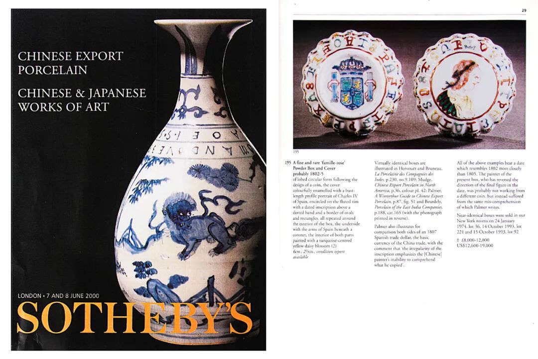 在18世纪中西方艺术与文化交流中,以西洋人物作为瓷器装饰的主题成为显著的中西融合的典范。无论是幽静淡雅的青花瓷还是艳丽多姿的彩绘瓷,都在以西洋人物这一特殊的装饰题材,表达着特定文化背景下,中西融合所体现出来的多样化艺术形态。此件青花香盒便是十八世纪制品,整体为传统的菊瓣型,浑圆饱满,天地盖上下扣合,内施白釉,器身之上施青花,盒盖顶面开光,内青花绘制西洋人物,为一位雍容的贵妇人半身侧像,神态恬静。其绘画手法已经吸取了西洋绘画的一些技法,如背景青花的渲染。盒内上下绘制桃实,并蒂双生,吉庆祥瑞。盒底亦施青花,在青花底色中留白绘制一枚桃实,应是押款。此件香盒反应了中国传统的以线造型和西方以光影与体积塑造形体的方法共同塑造了人物的形象。从中反映了中西文化双方有选择地借鉴和吸纳的事实。同类拍品可参见伦敦苏富比,2000年6月7日,编号195。