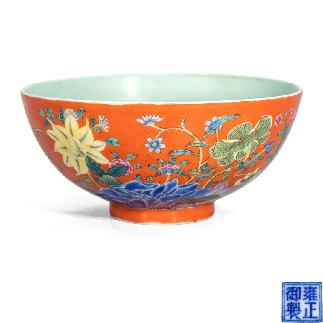 此件珐琅彩花卉纹碗,撇口,弧壁,深腹,圈足。外壁以珊瑚红釉为地,珐琅彩绘折枝花卉纹,富丽的芍药、虞美人、俯仰盛开,色彩绚丽,其间点缀数朵各色小花。花朵硕大饱满,枝蔓舒展,寓有「年年富贵」吉祥之意。内壁施松石绿地釉,外底蓝料彩双方栏内书「雍正御制」四字双行款,字体笔画粗宽,挺拔端庄。该器以雍正珐琅碗为模本,造型端庄,胎薄体轻,装饰技法受清初恽南田、蒋廷锡等宫廷画家影响采用没骨画法绘制,花卉俯仰有致,极尽妍丽,充满生机,立体感强,彩料瑰丽纯正,为晚清民国时期珐琅彩瓷中属凤毛麟角之品。