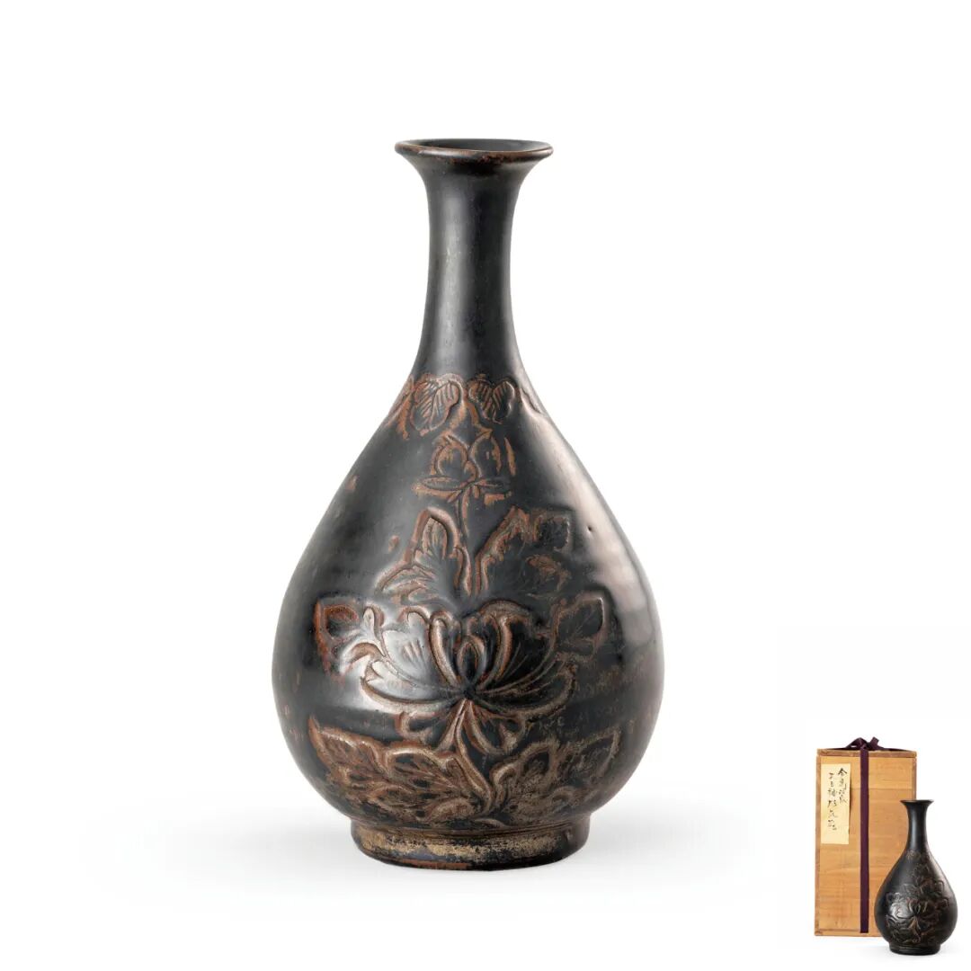 此件黑釉玉壶春瓶造型沉稳端庄,唇口外撇,长束颈,溜肩,垂鼓腹,底承圈足,足壁宽平。里外满施纯黑釉,为建窑产品的常见釉色,文献称为「绀黑」。釉面沉着厚润。裹足内亦施釉,足底可见垫饼烧痕迹。应为匣钵烧精品瓷器。器身之上有印花,颈下肩上一周花叶纹饰,器身之上前后对称装饰两枝盛放的牡丹花,富丽端庄。此件玉壶春瓶的装饰手法为先于胎体之上刻花后复施黑釉烧制,所以在刻痕的凹凸下,黑色釉也产生了薄厚色彩上的瑰丽变化,于一片肃穆之中增加了一份生机与活力。