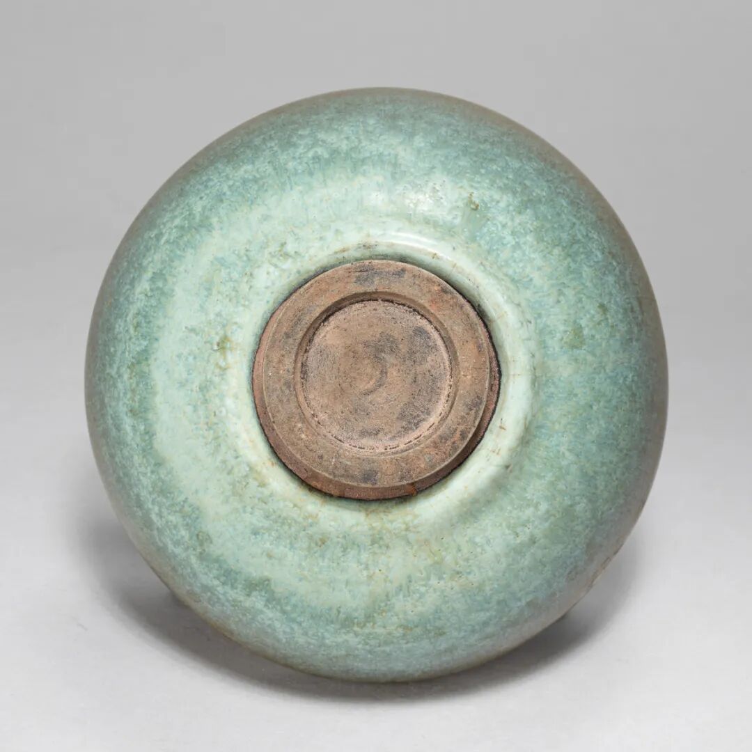 此件钧窑玫瑰紫斑茶盏,直口微敛,斜腹内收,圈足,底部有旋胚痕,足墙宽平。胎骨厚重,胎色浅黄。釉色以天青色为主,釉色明快润泽,有冰裂纹及鬃眼。碗外壁施釉不到底,有垂珠现象。内壁有一大一小两块玫瑰紫斑,鲜艳而凝重,生动娇润,互相映衬,宛如初秋天边的晚霞,在玫瑰红、深紫和天蓝之间旖旎变幻的绮丽颜色。论及器形、釉色,有二钧碗与此相近,藏北京故宫博物院,录于《钧瓷雅集:故宫博物院珍藏及出土钧窑瓷器荟萃》,北京,2013年,图版6、7;另录一碗例,釉较乳浊,图版8。养德堂旧藏也有一器,载于《中国名陶展 : 中国陶磁2000年の精华》,东京,1992年,编号42,售于纽约苏富比2015年3月17日,编号85;仍有一例,先后售于香港佳士得2011年6月1日,编号3501,及2016年6月1日,编号3118。